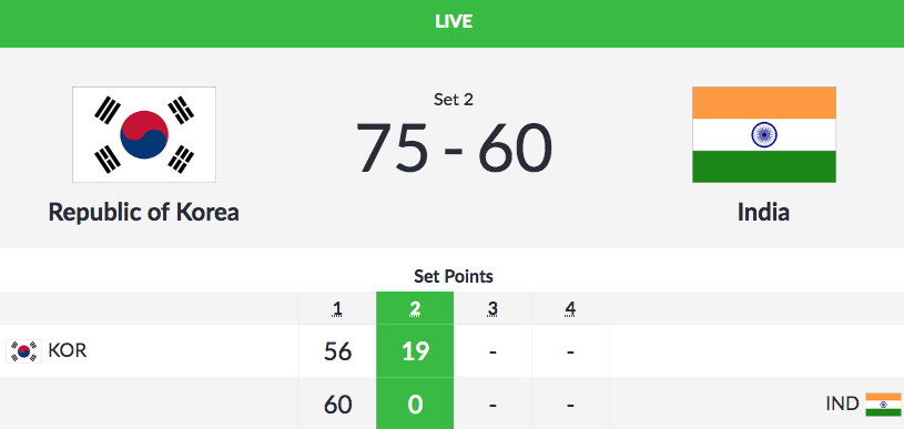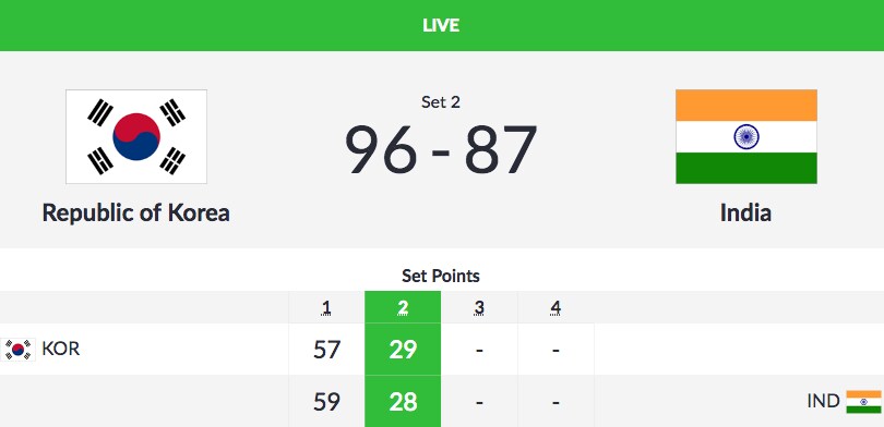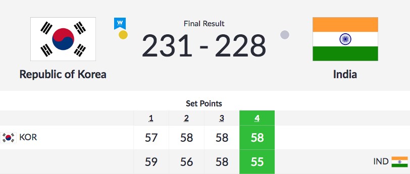India were leading 59-57 after the first set before Korea won the second set 58-56. With the scores level at 173-173, both teams were on even keel in the third set scoring 58 points each but India wilted under pressure losing 55-58 to end up second best.