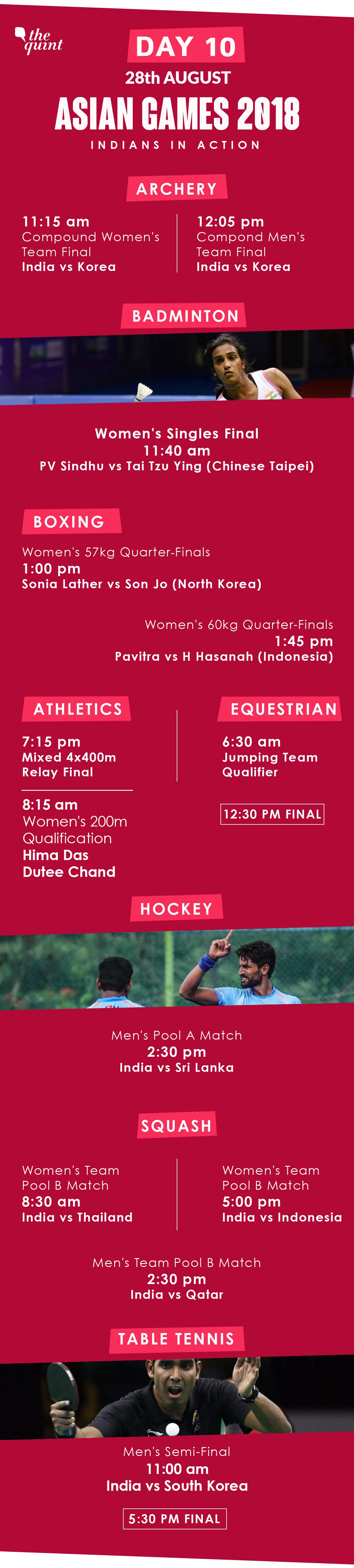 On the tenth day of the 18th Asian Games, the Indian men's and women's compound archery teams will both be in action. They will fight Korean teams in the final for a gold.
