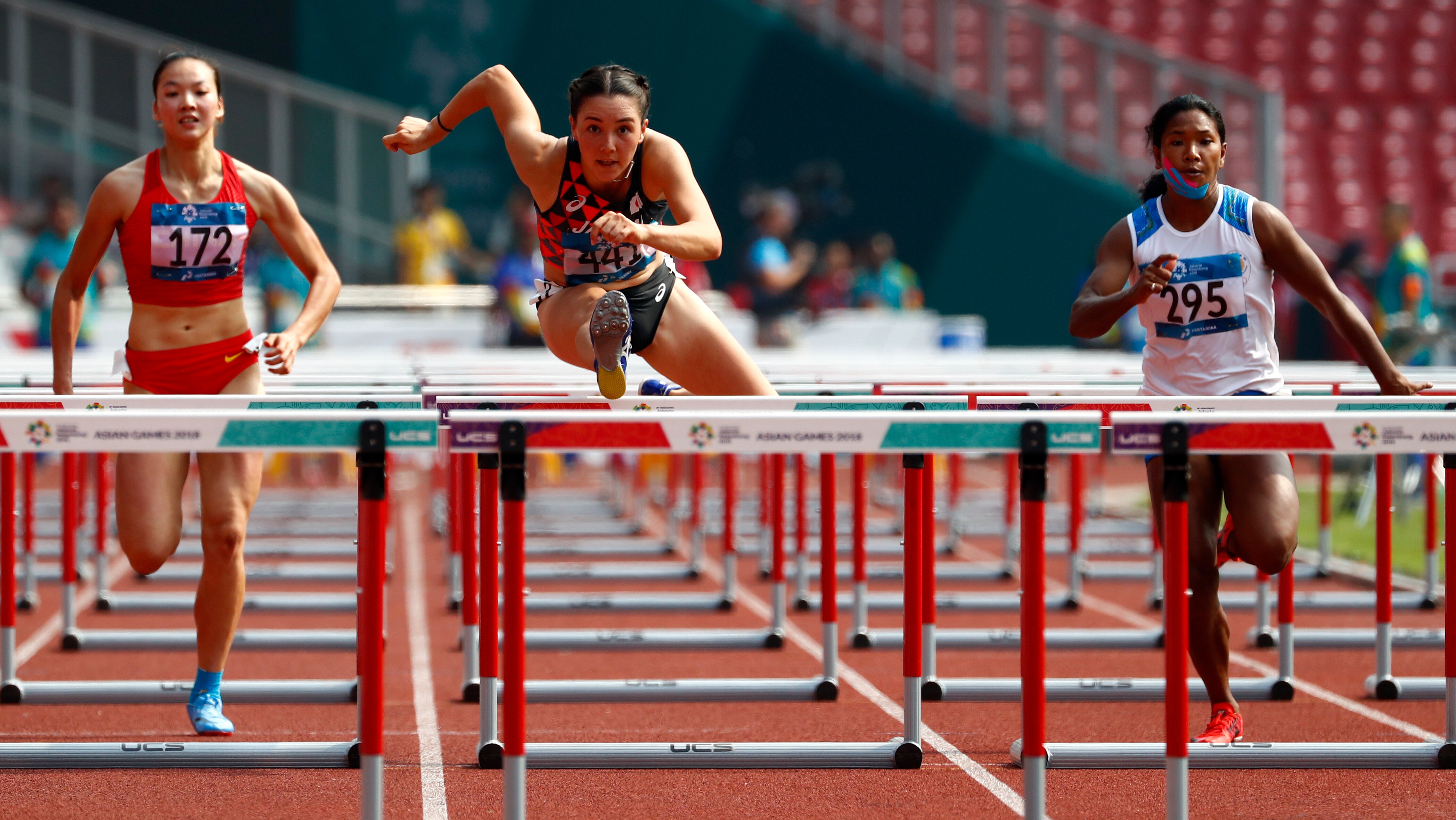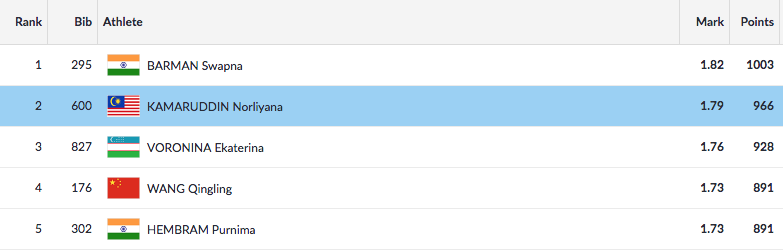 With a taped chin, Swapna has been super impressive in the high jump event, clearing all 1.73, 1.76, 1.79 and 1.82 on her first attempts! She is currently in the lead, while Purnima sits in fifth place.
