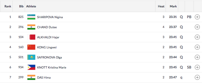 It's not over for Hima, just yet. She really caught up in the last 100 meters and finished with a time of 23.47. While just the top 3 runners from each heat make it through, there's always an opening for the 'fastest loser' and in this case it may be Hima who finished fourth in her heat with a time that was still better than what the winner of Heat 1 clocked.