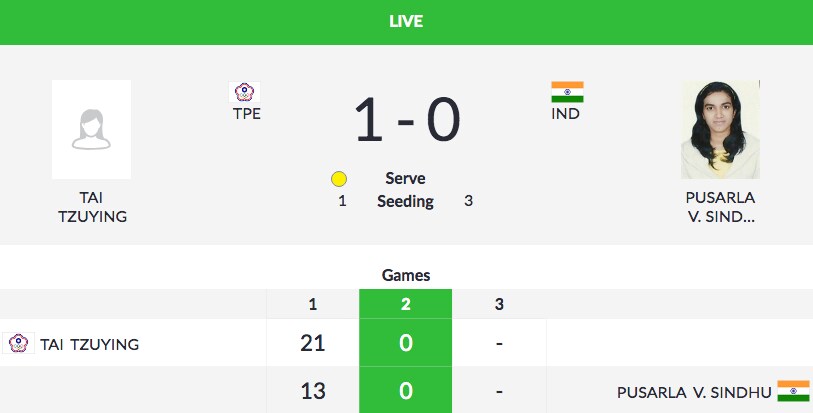 PV Sindhu has the lost the first game 13-21 to World no 1 and top seed Tai Tzu Ying. Sindhu won two points after the break, reducing her opponent's lead to 11-9.