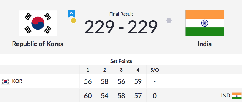 Once again, the scores were level. However, the Koreans bagged the gold courtesy having more arrows in the centre circle.