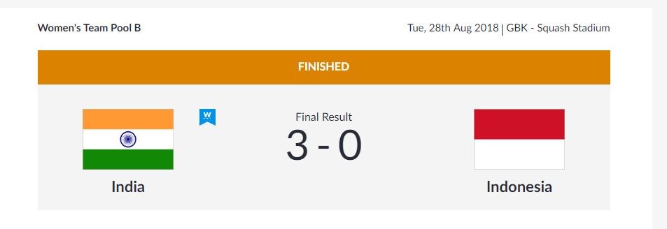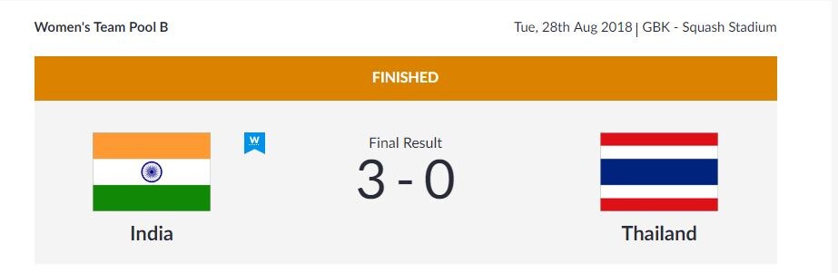 Women: India bt Thailand 3-0 (Joshna Chinappa bt Prasertratanakul Anantana 11-9, 12-10, 11-6; Sunayna Kuruvilla bt Thamronglarp Tuddaw 11-2, 11-6, 11-2; Tanvi Khanna bt Phongrattana Pranghatai 11-3, 11-4, 11-2); India bt Indonesia 3-0 (Dipika Pallikal Karthik bt Rohmah Yeni Siti 11-5, 11-5,11-7; Sunayna Kuruvilla bt Maryani Irma 11-3, 11-9, 11-1; Tanvi Khanna bt Nadiya Maudy Wafa 11-1, 11-3, 11-7).