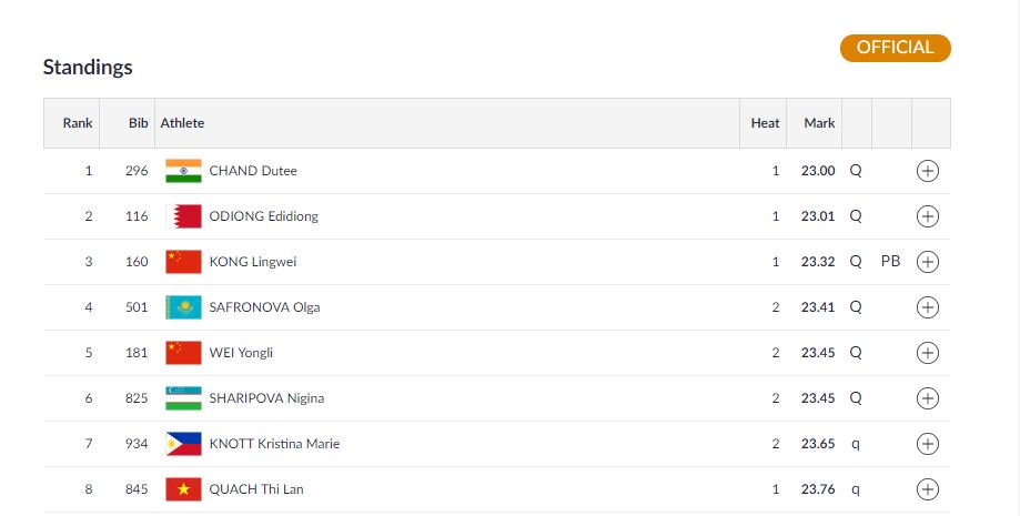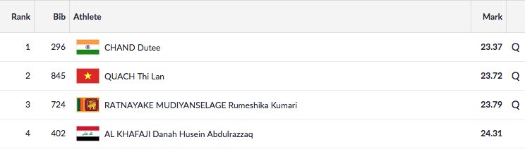 Dutee finished first in Heat 4, and second overall with a timing of 23.37.