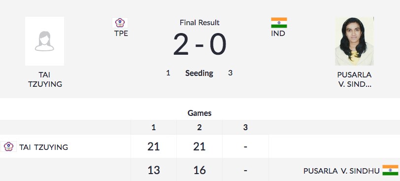 World no 3 Sindhu wasn't any match to her opponent who maintained a lead through the match. Comprehensive win for Tai, and she now has a 10-3 head-to-head lead over Sindhu.