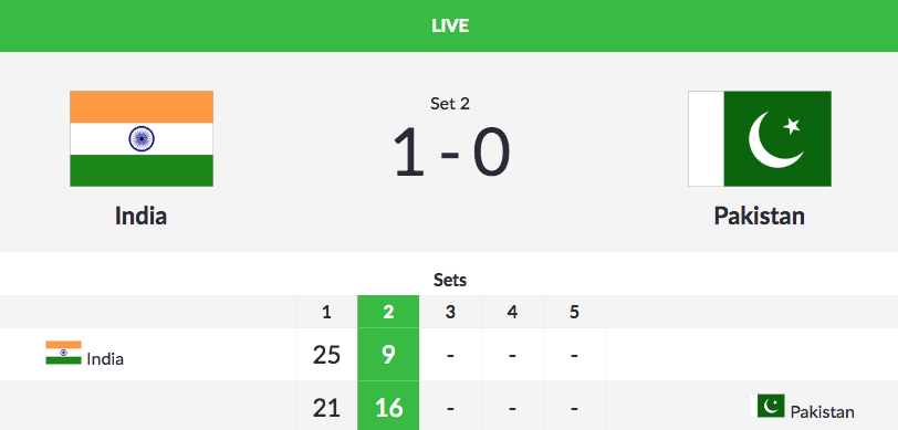 India have won the first set 25-21 against Pakistan in the quarter-final of the men's volleyball tournament.