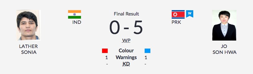 Indian boxer Sonia Lather loses her 57kg quarter-final bout to North Korea's Son Hwa Jo.