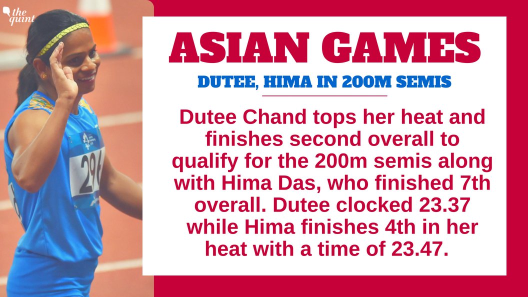 Dutee Chand and Hima Das qualify for the semi-finals of the women's 200m event! Both athletes, who've already bagged silvers in this Asian Games, finished just 0.10 seconds apart in the heats.