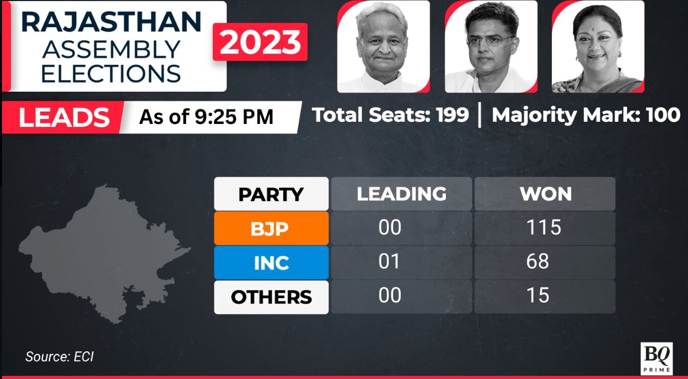 Rajasthan Results: BJP wins 115 seats, Congress leads in 1 seat where counting is still underway.
