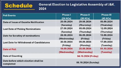 The Election Commission announced the schedule for assembly elections. Jammu and Kashmir will vote in three phases, while Haryana on single day. Dates for Maharashtra and Jharkhand have not been announced.
