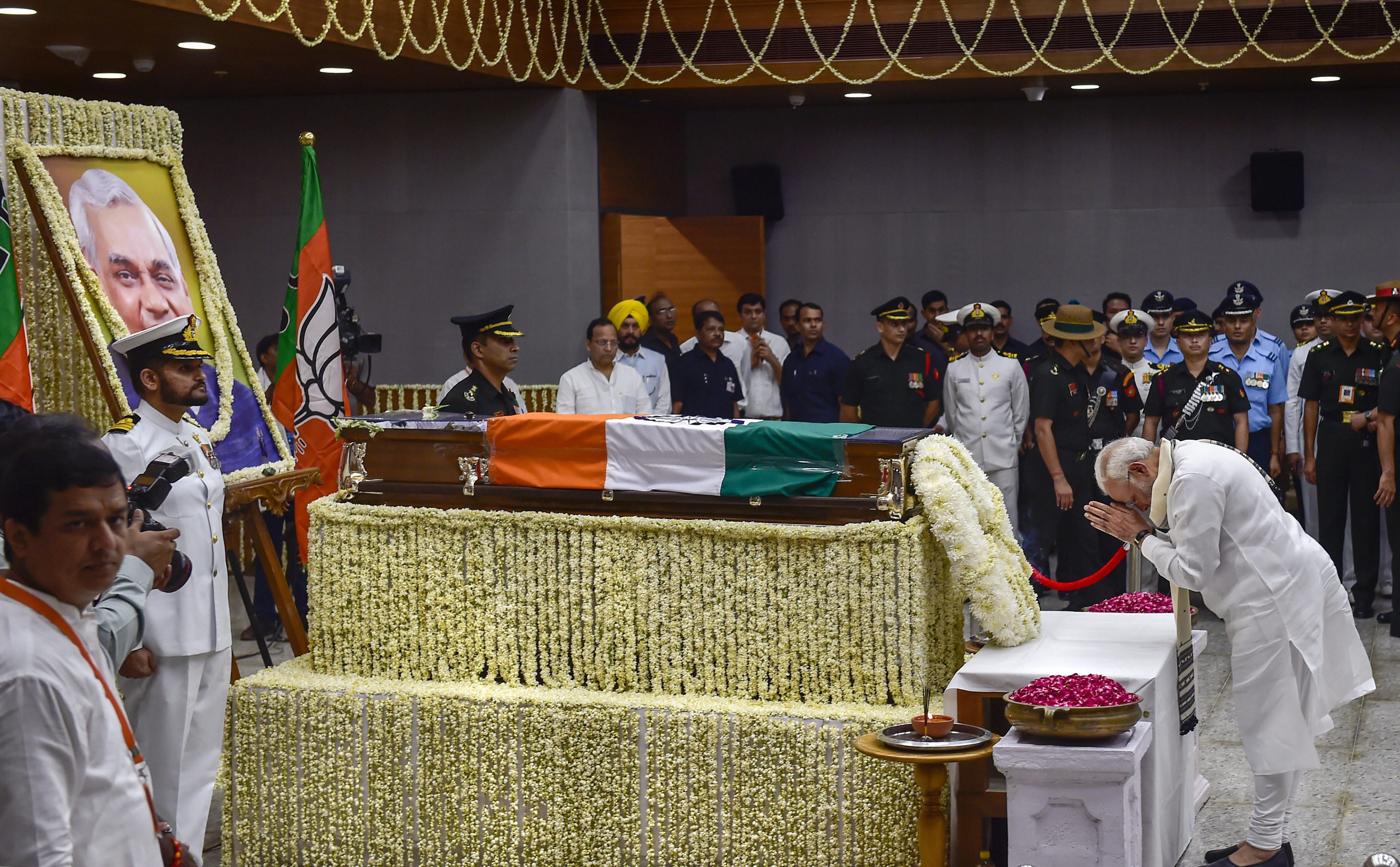 Prime Minister Narendra Modi pays last respects to the former prime minister at BJP headquarters.