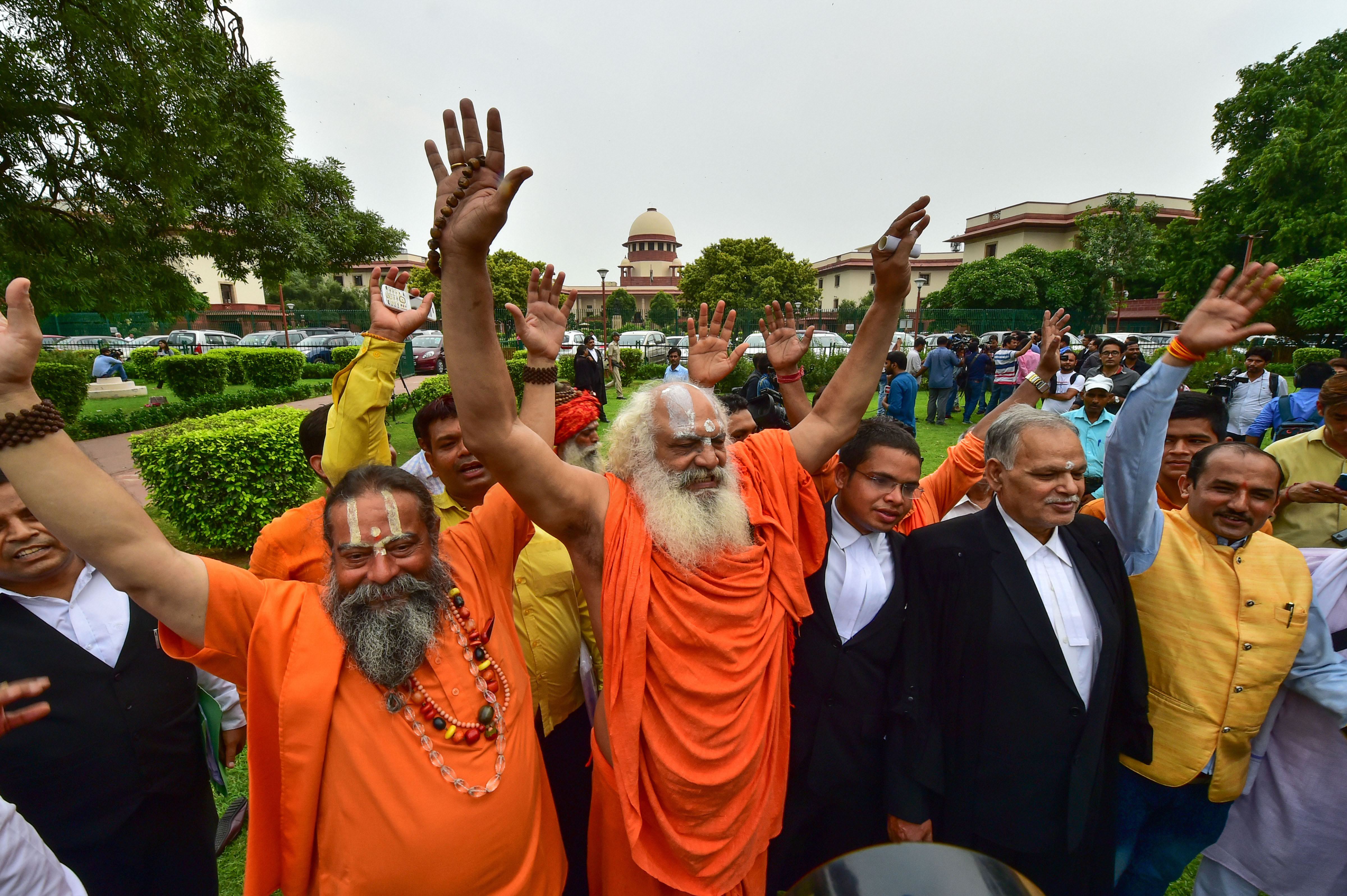 Mahant Dharam Das and others react after Supreme Court hearing on Ayodhya land dispute case, in New Delhi, Friday, Aug 2, 2019. (Source: PTI)