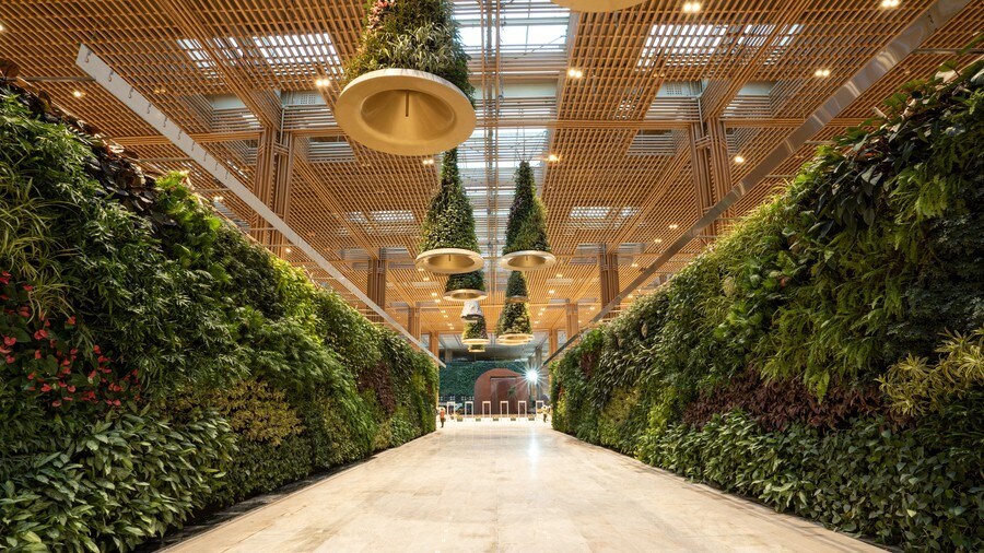 The terminal is meant to be a “walk in the garden”, with passengers travelling through 10,000+ square metres of green walls, hanging gardens, and outdoor gardens built through indigenous technology.