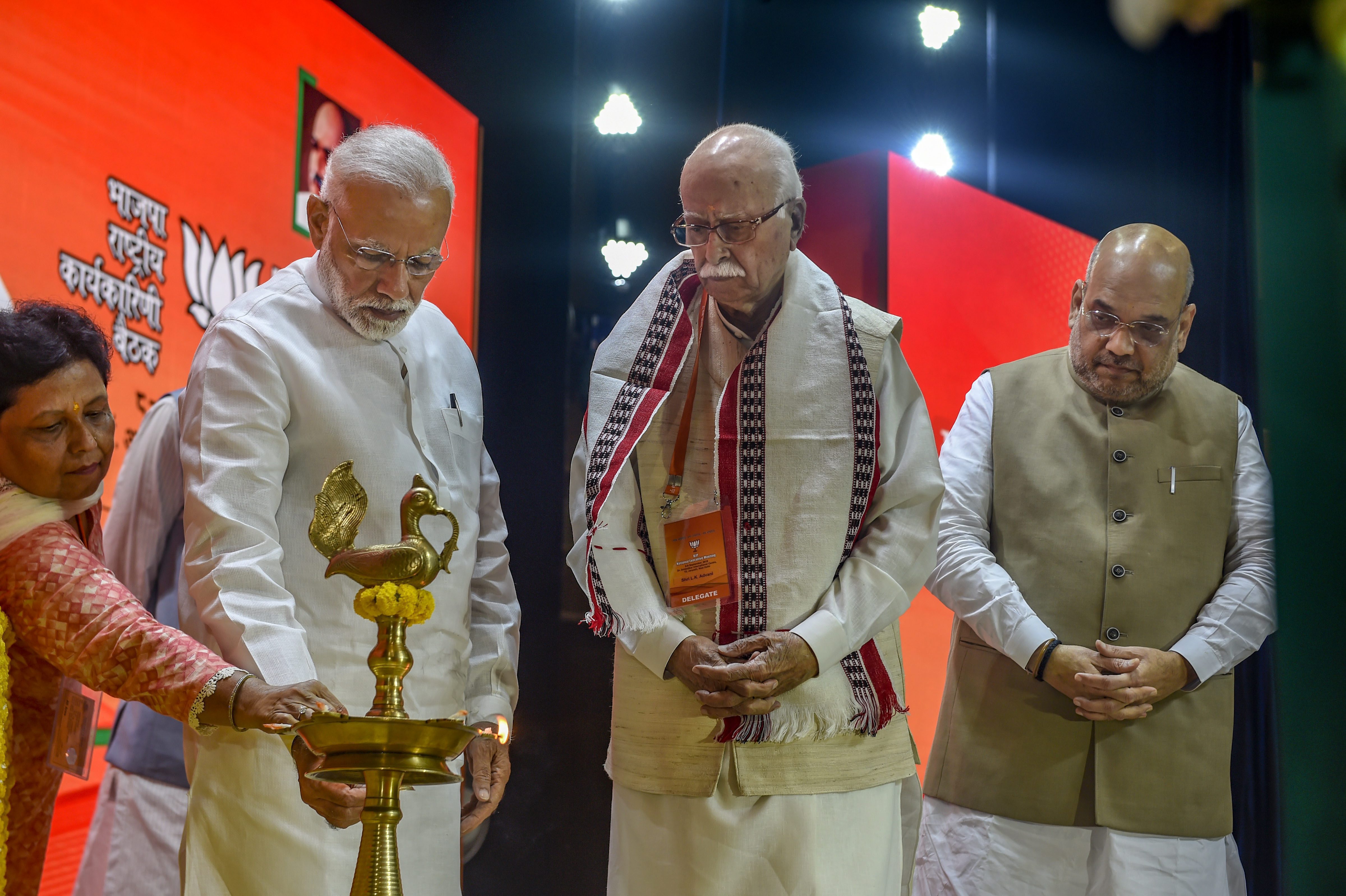 Prime Minister Narendra Modi, BJP President Amit Shah, senior BJP leader Lal Krishna Advani and Finance Minister Arun Jaitley have arrived at BJP National Executive Meet at Ambedkar International Centre.