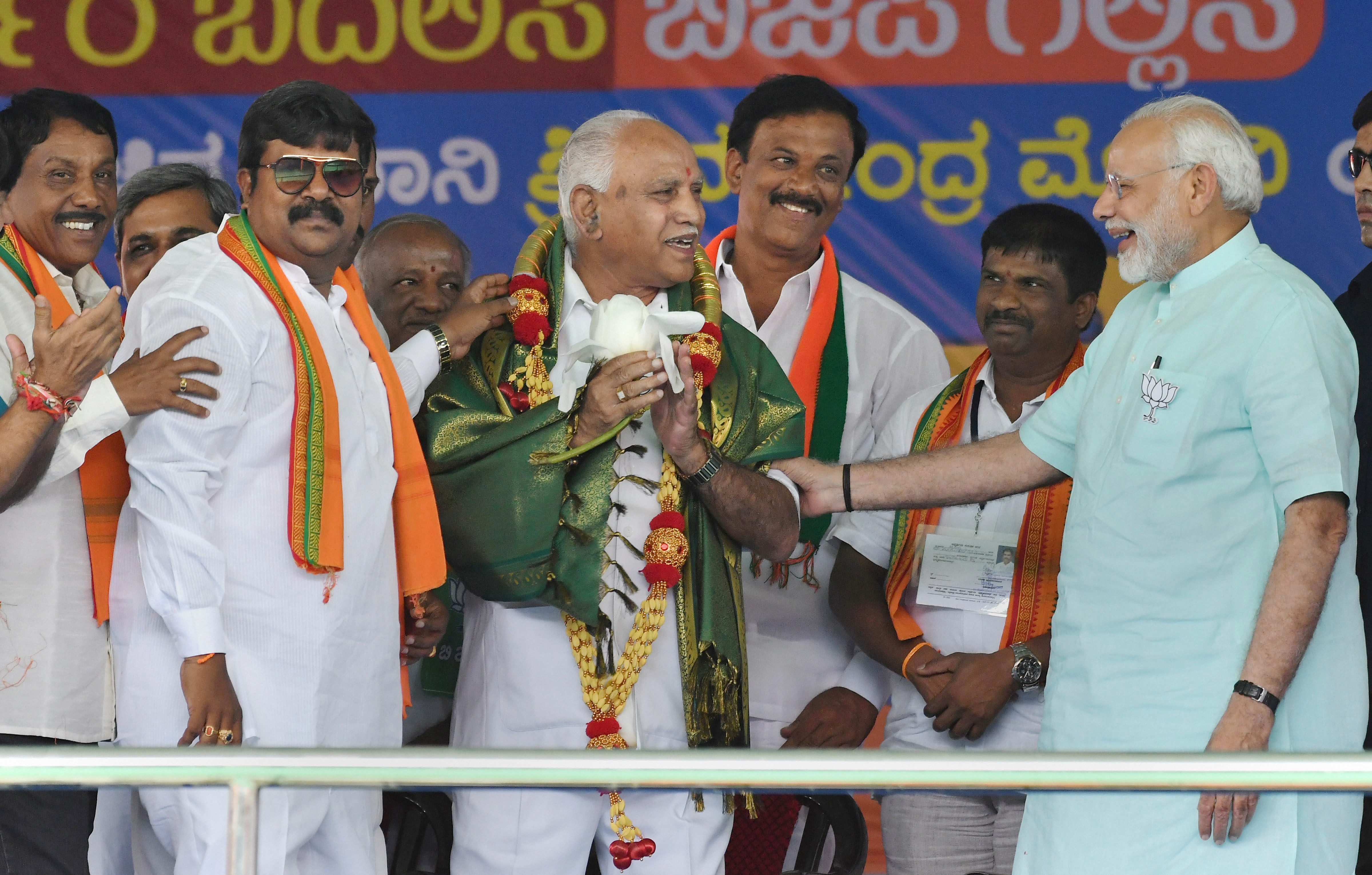 Prime Minister Narendra Modi and BJP’s chief ministerial candidate BS Yeddyurappa share a lighter moment during Karnataka election campaign rally at Chamarajanagar on Tuesday. (Source: PTI)
