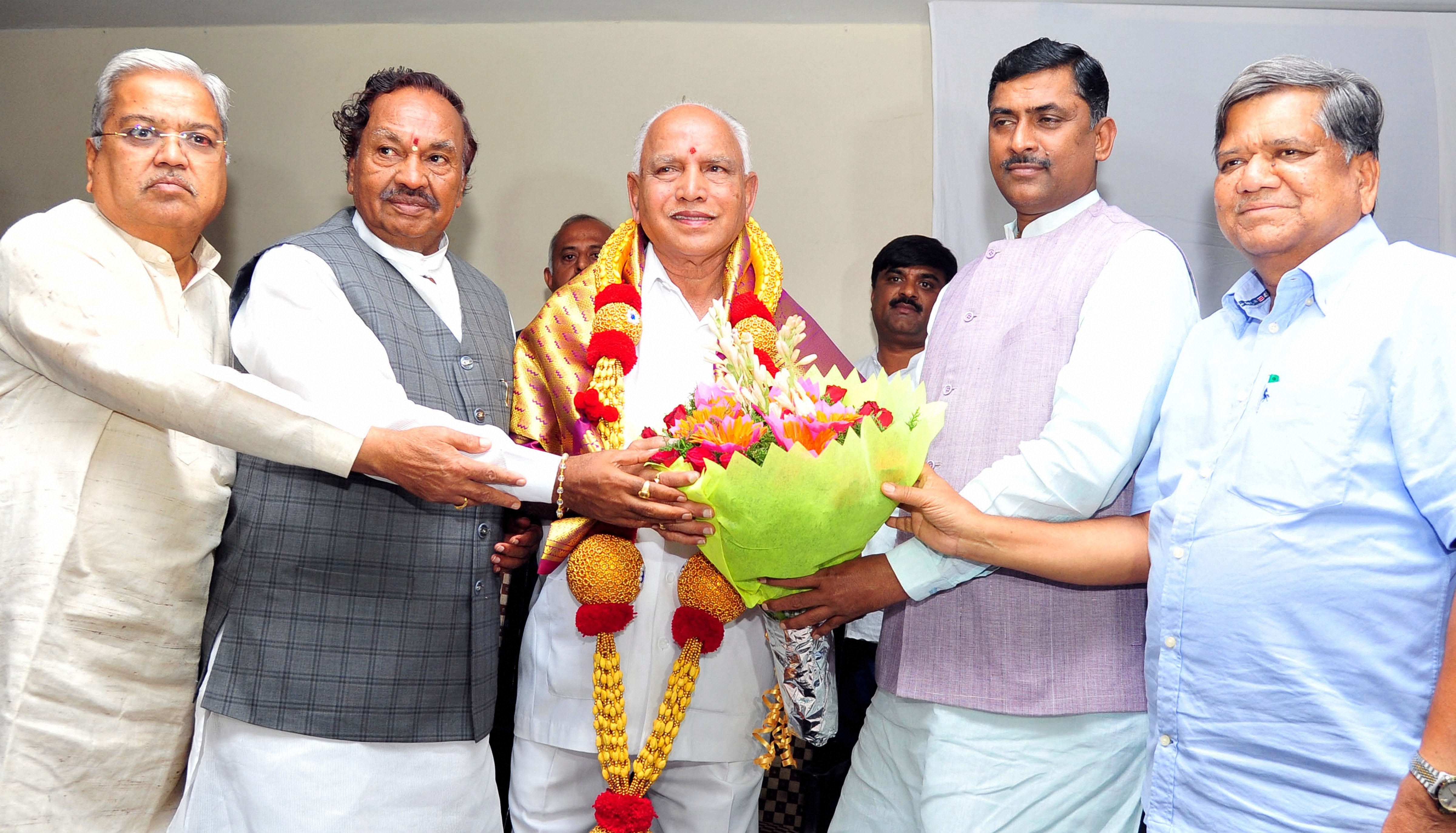 Karnataka Chief Minister BS Yediyurappa being felicitated during a meeting with BJP MLAs in Bengaluru. (Photo: PTI)