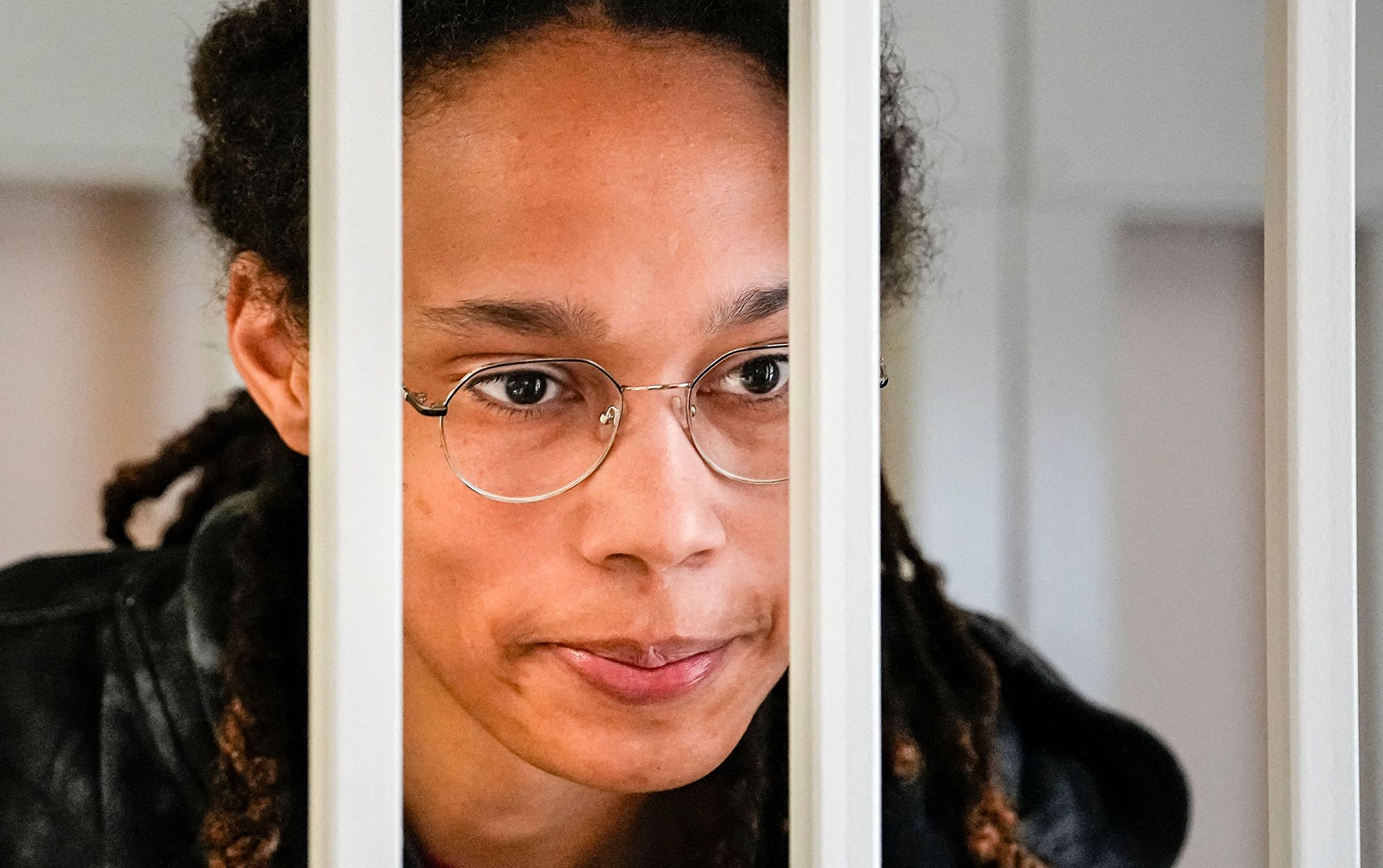 Brittney Griner inside a cage before a hearing at the Khimki Court, outside Moscow on July 26, 2022. Photographer: Alexander Zemlianichenko/AFP/Getty Images