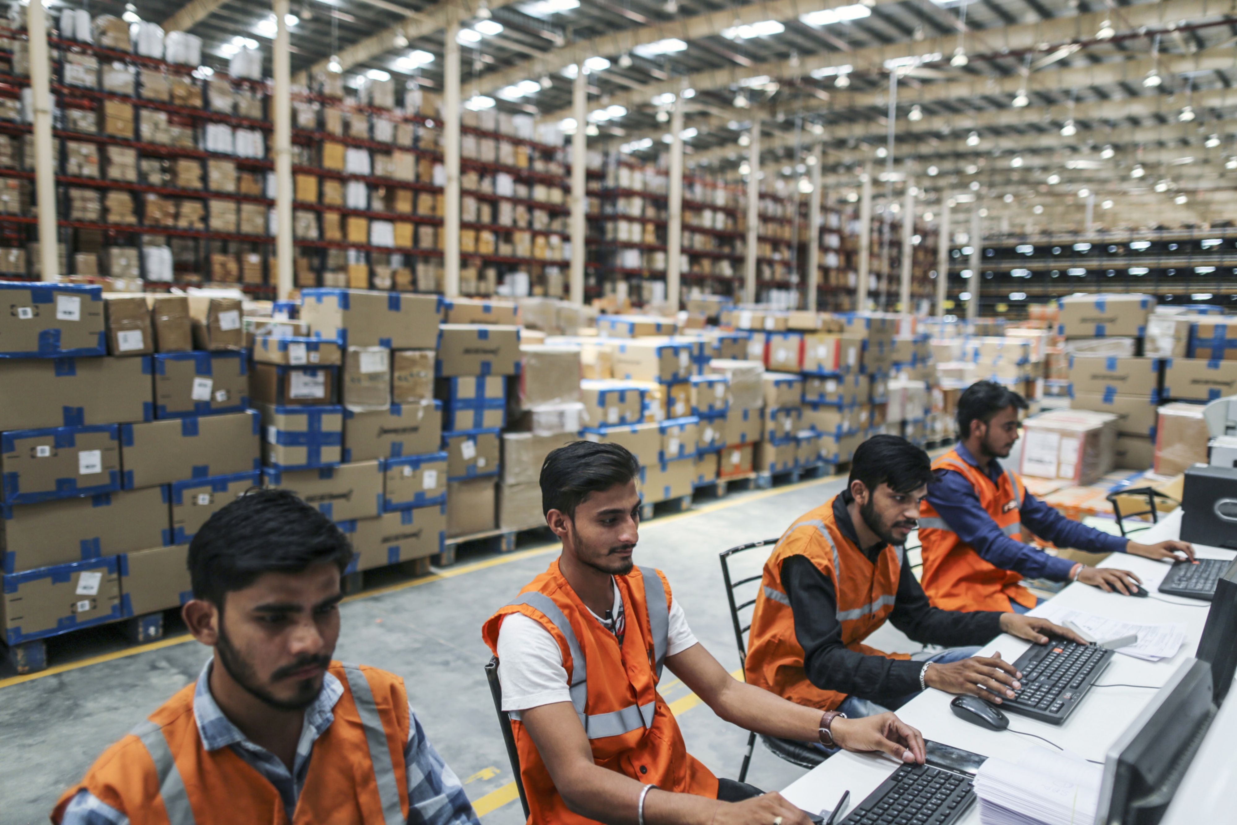 Employees use desktop computers at a warehouse operated by Future Supply Chain Solutions Ltd. near the Multi-modal Cargo International Hub Airport at Nagpur. Photographer: Dhiraj Singh/Bloomberg