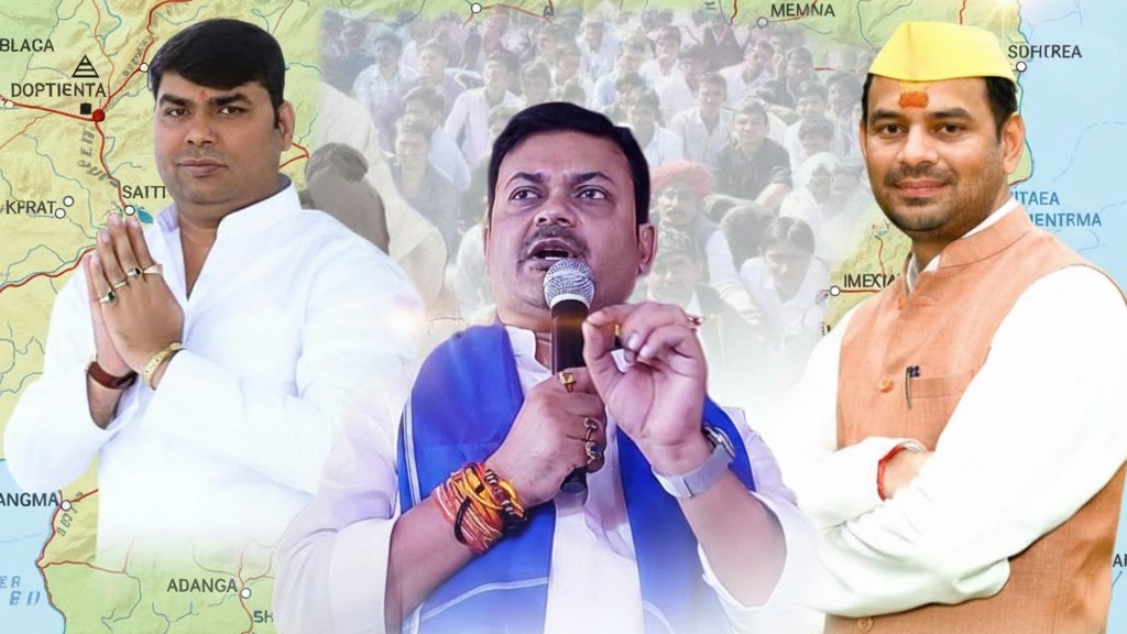 Bihar Elections 2025: (from left to right) Dr Mukesh Kumar Raushan of the RJD, Sanjay Kumar Singh of the Lok Janshakti Party (Ram Vilas) and Tej Pratap Yadav, who is contesting on a Janshakti Janata Dal ticket. (Image: Gemini AI)