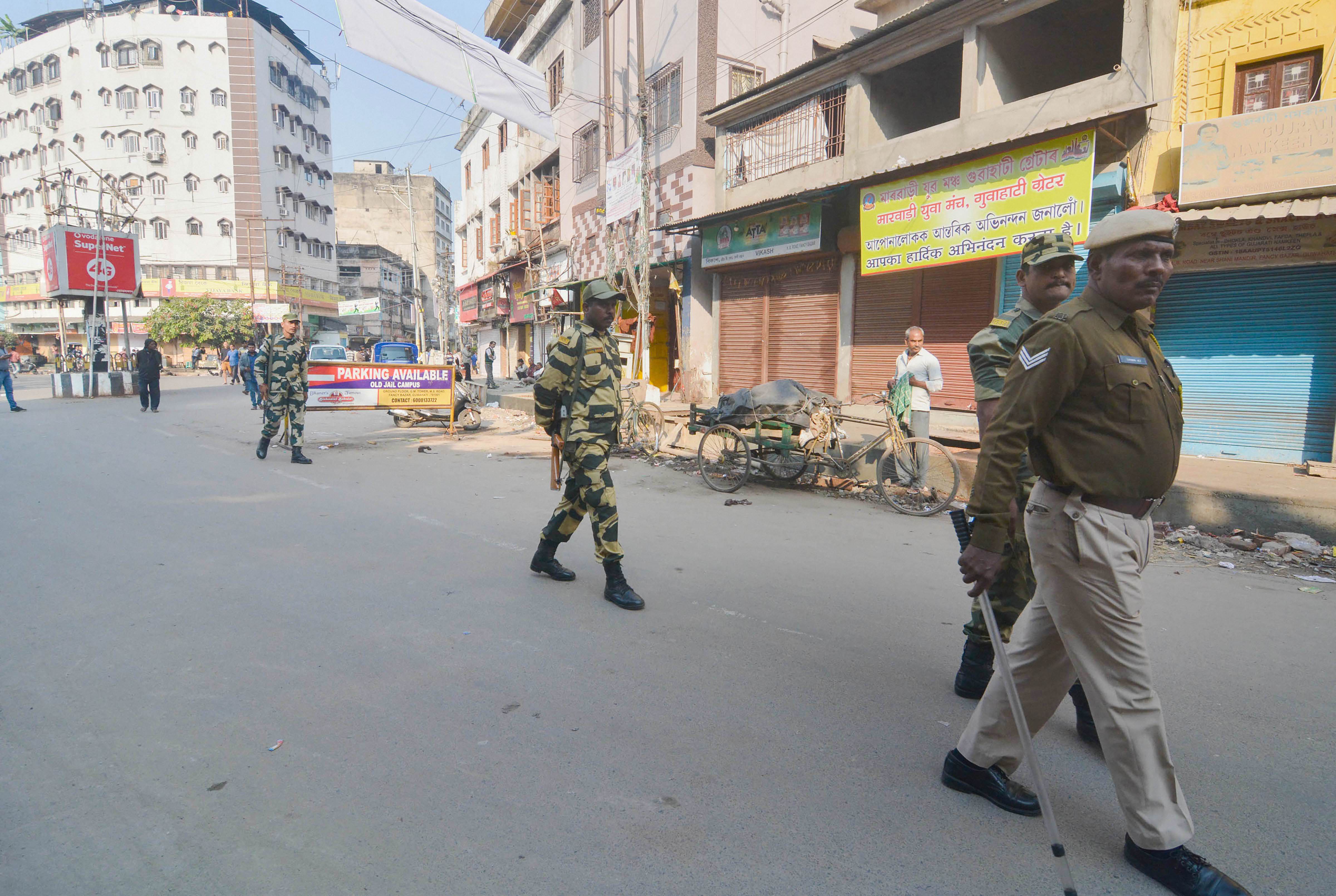 Security personnel patrol a street in Guwahati. (Source: PTI)