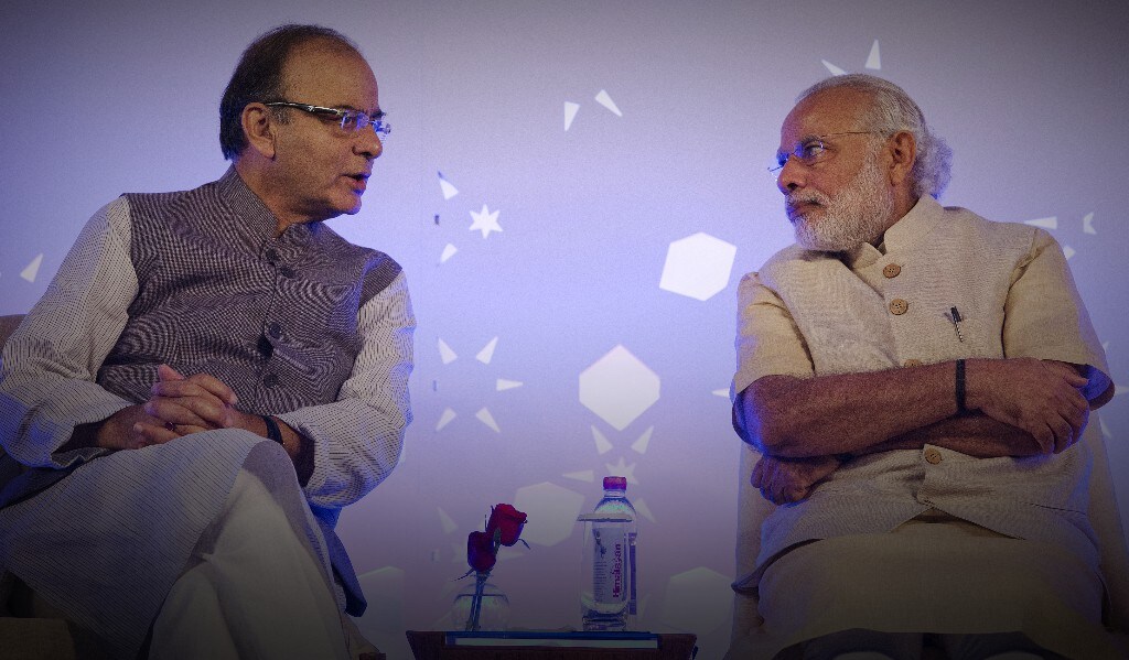 Finance Minister Arun Jaitley speaks with Prime Minister Narendra Modi (Photographer Kuni Takahashi/Bloomberg)