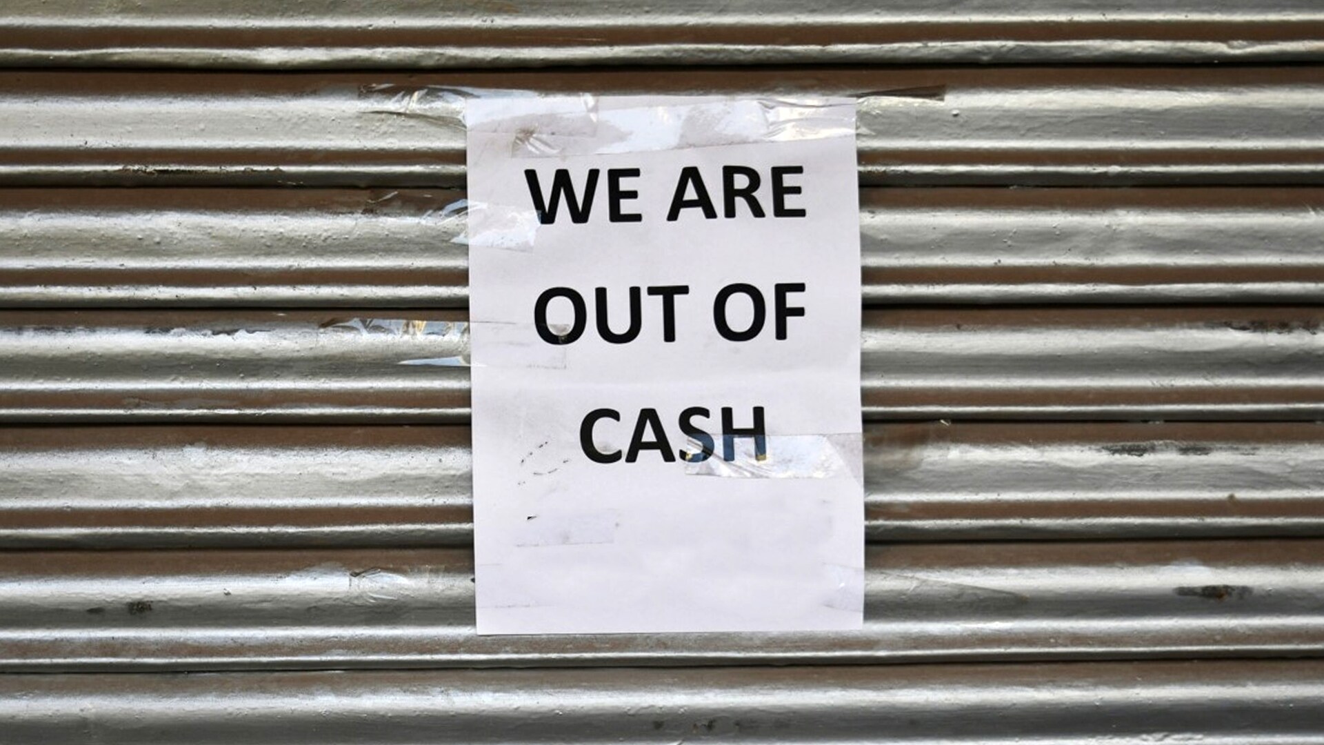 A notice reading “We Are Out Of Cash” is displayed on the shuttered entrance. (Photographer: Anindito Mukherjee/Bloomberg)