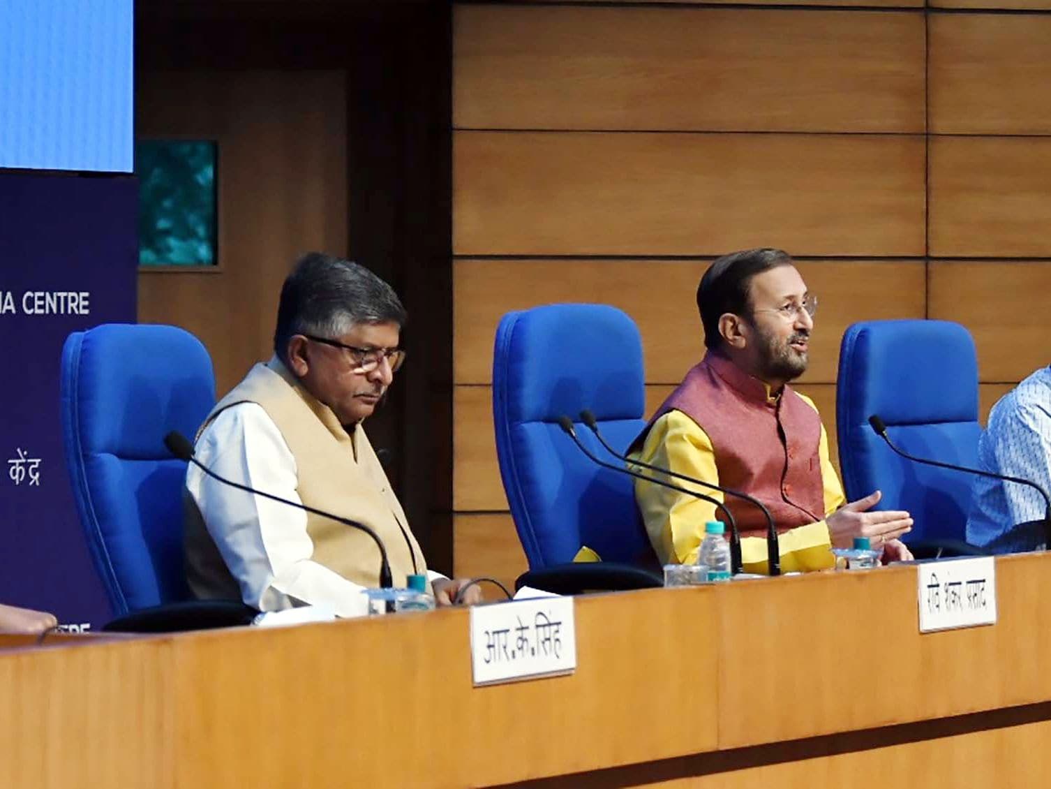 Then Union Ministers Ravi Shankar Prasad and Prakash Javadekar, addressing a press conference on cabinet decisions, in New Delhi on June 30, 2021. (Photograph: PIB)