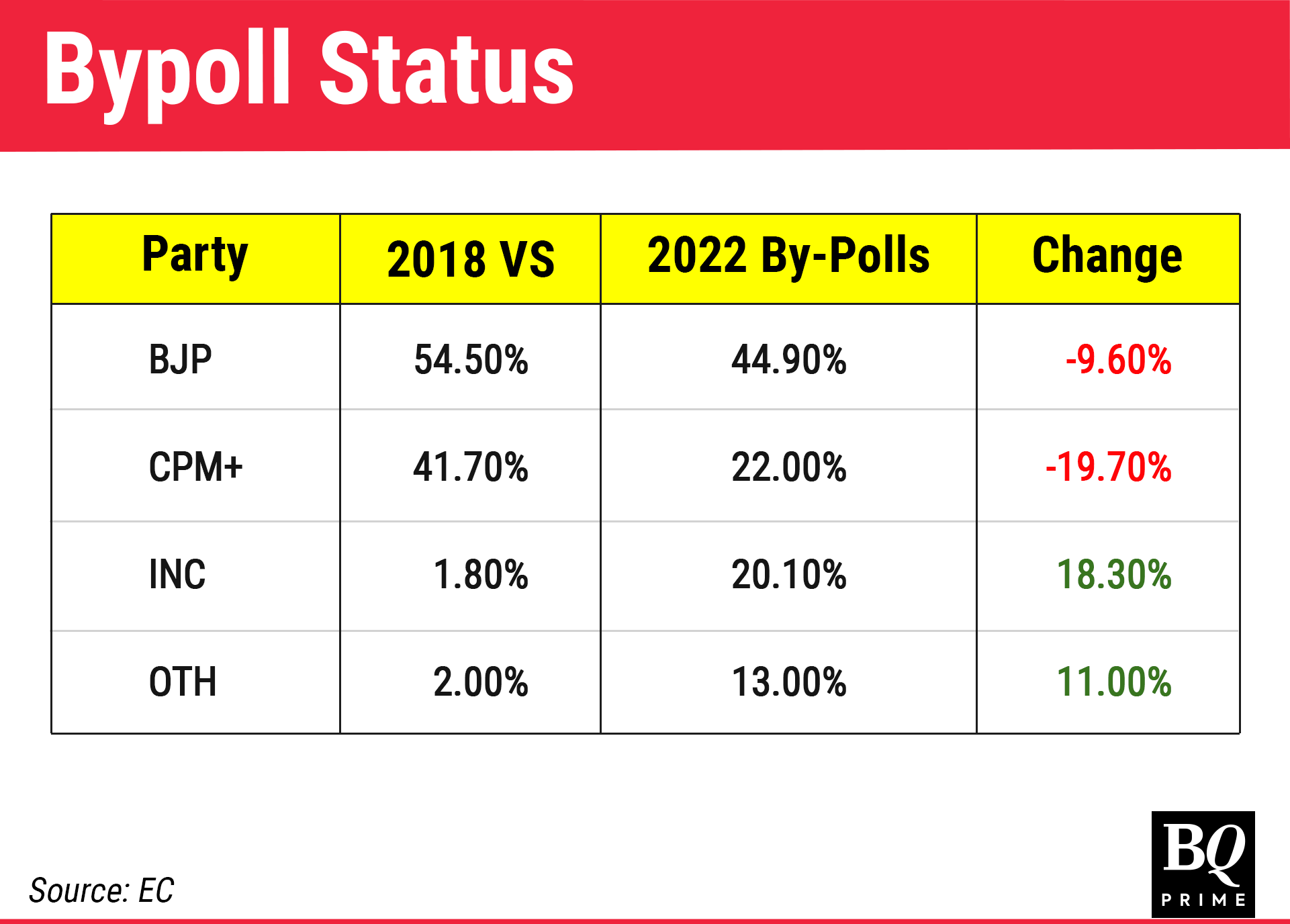 The BJP won three of the four seats on which bypolls were held in 2022. Two were necessitated by the death of sitting MLAs, while two were due to exodus from the BJP to the Congress. While the grand old party did manage to win a seat, the BJP benefited from a split in opposition votes, despite losing vote share. In fact, Congress emerged as the main opposition to the BJP in the bypolls ahead of CPM, bagging a higher vote share.