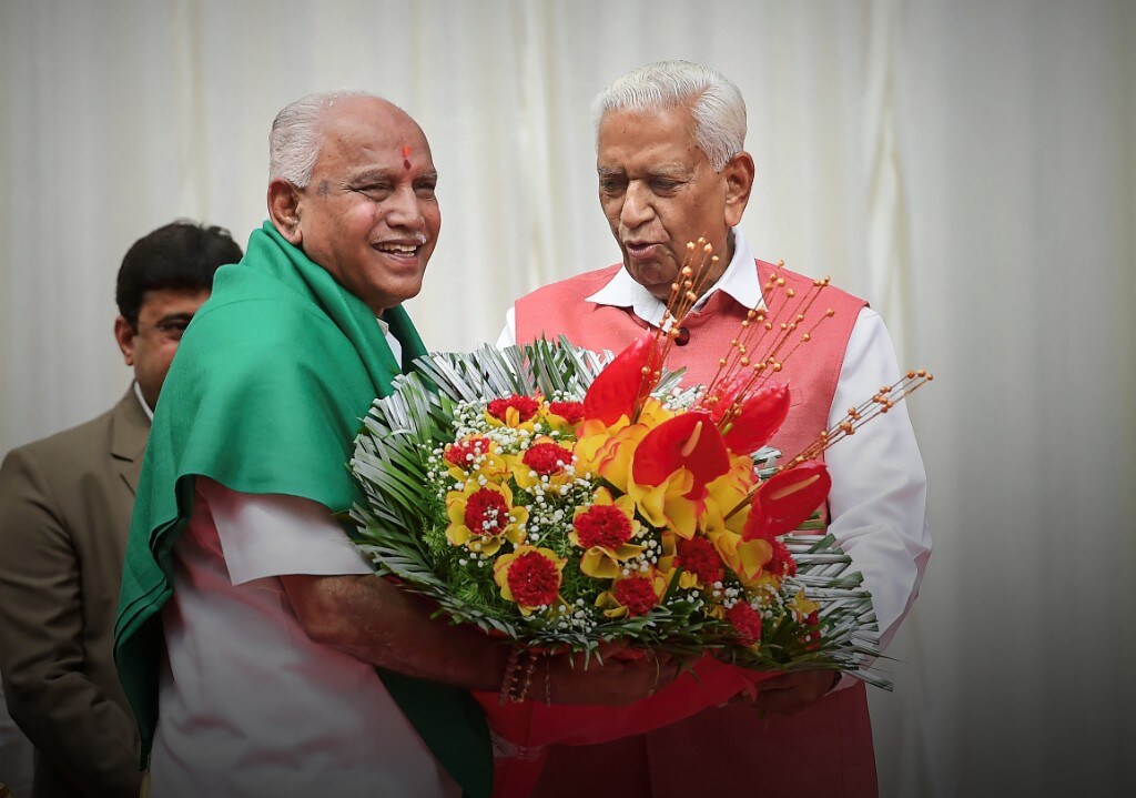 Karnataka Governor Vajubhai Vala greets newly sworn-in Karnataka Chief Minister B. S. Yeddyurappa, at a ceremony in Bengaluru. (Photographer: Shailendra Bhojak/PTI)