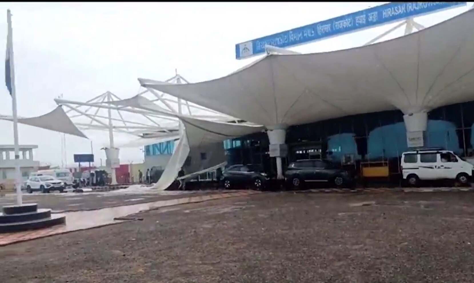 A canopy at Gujarat's Rajkot Airport collapsed amid heavy rainfall on Saturday, according to a report by new agency PTI. The incident occurred at the passenger pickup and drop area outside the Rajkot airport terminal.