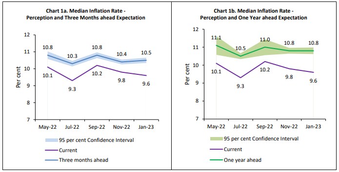 Households' inflation perception for the current period moderated by 20 basis points to 9.6% in January 2023.