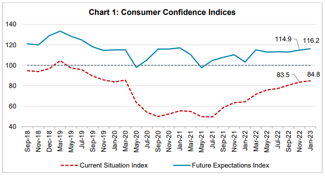 The current situation index continued on its recovery path for the ninth survey round, since the historic low recorded in mid-2021 and increased by 1.3 points to 116.2 in January 2023, on the back of improved sentiment on general economic situation and household income.