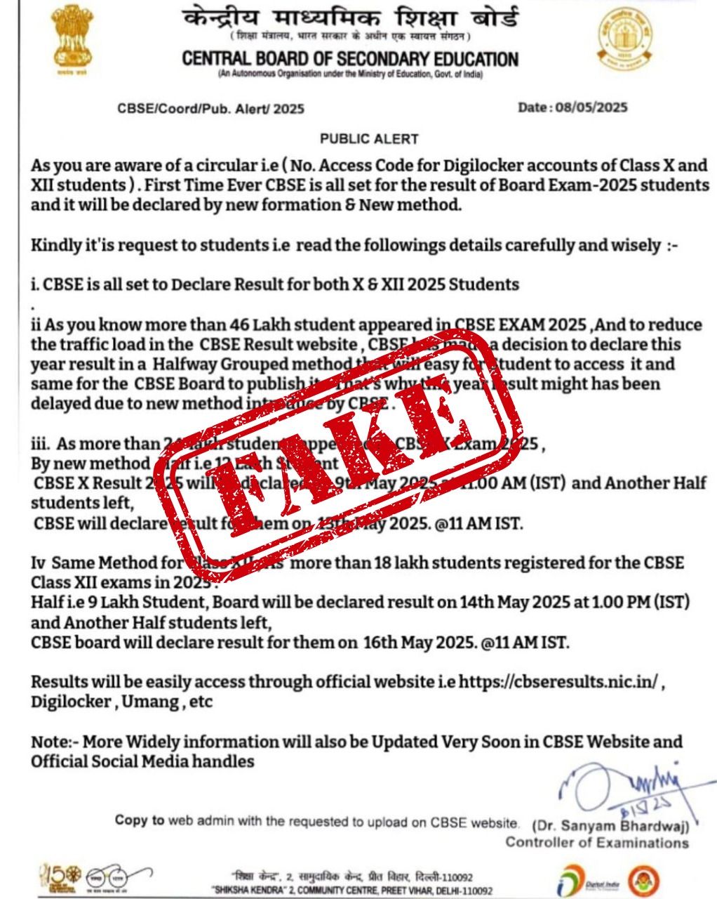 The Central Board of Secondary Education (CBSE) has alerted students and parents about a fake notice on CBSE Class 10th, 12th results 2025 which is circulating in social media.
