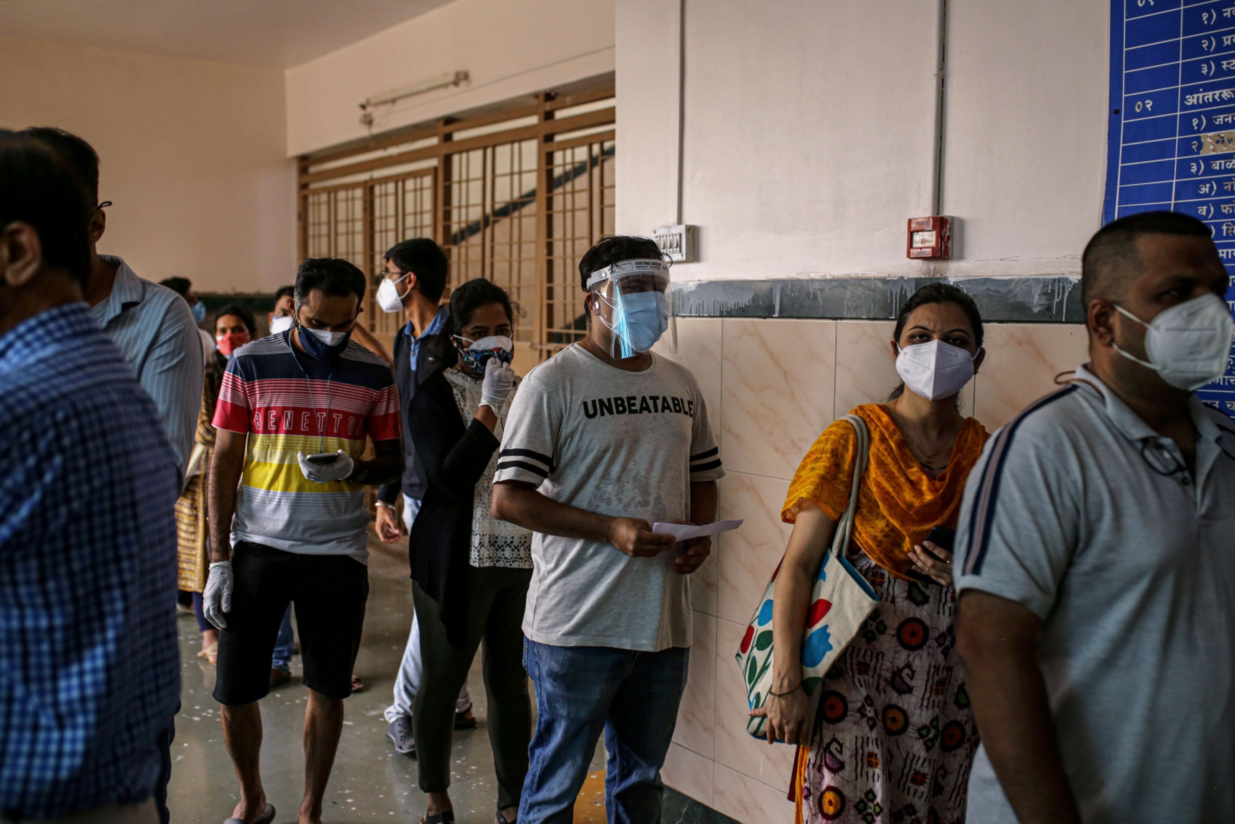 People wait in line a Covid-19 vaccination center at a municipal hospital in Pune. (Photographer: Dhiraj Singh/Bloomberg)