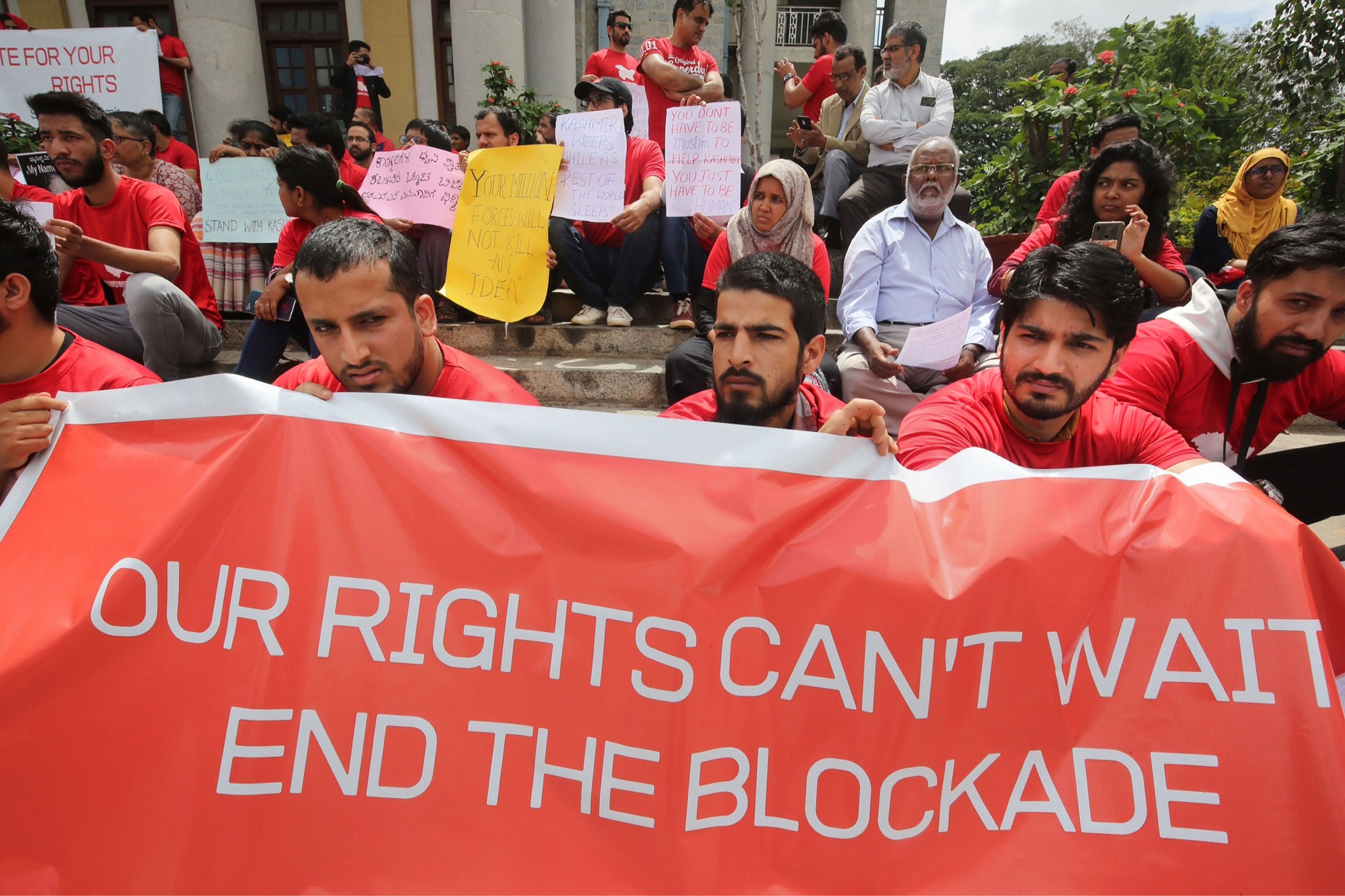 Kashmiri’s living in the city during a protest against the blockade of communication in Kashmir, in Bengaluru. (PTI)