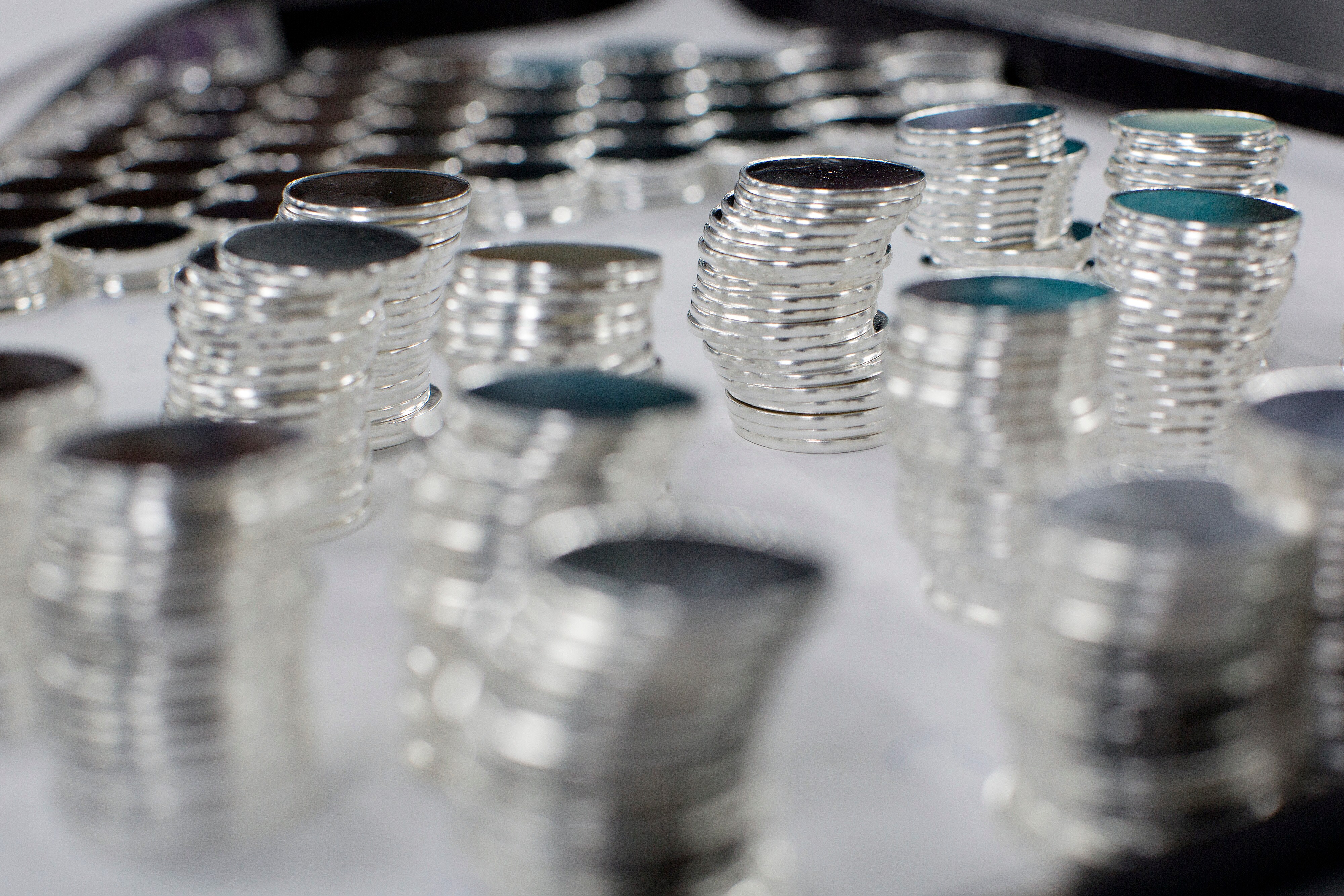 Silver coins sit in stacks before the minting process. (Photographer: Susana Gonzalez/Bloomberg)