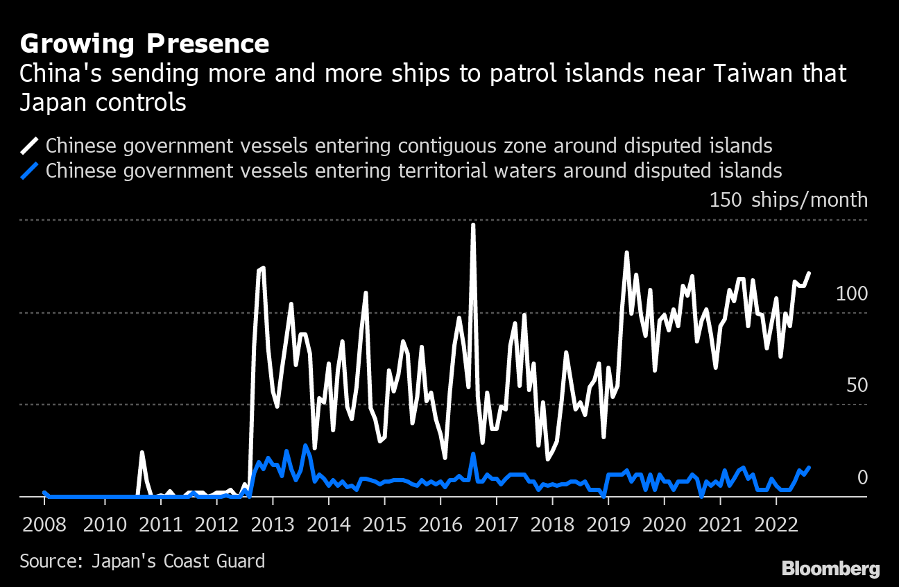 That's partly a function of worsening ties between China and the US, Japan's only formal military ally. The two are sparring over a range of issues, none more dangerous than the status of the self-governing island of Taiwan. Beijing sees the island as part of its territory, while US President Joe Biden has vowed to defend it against invasion.