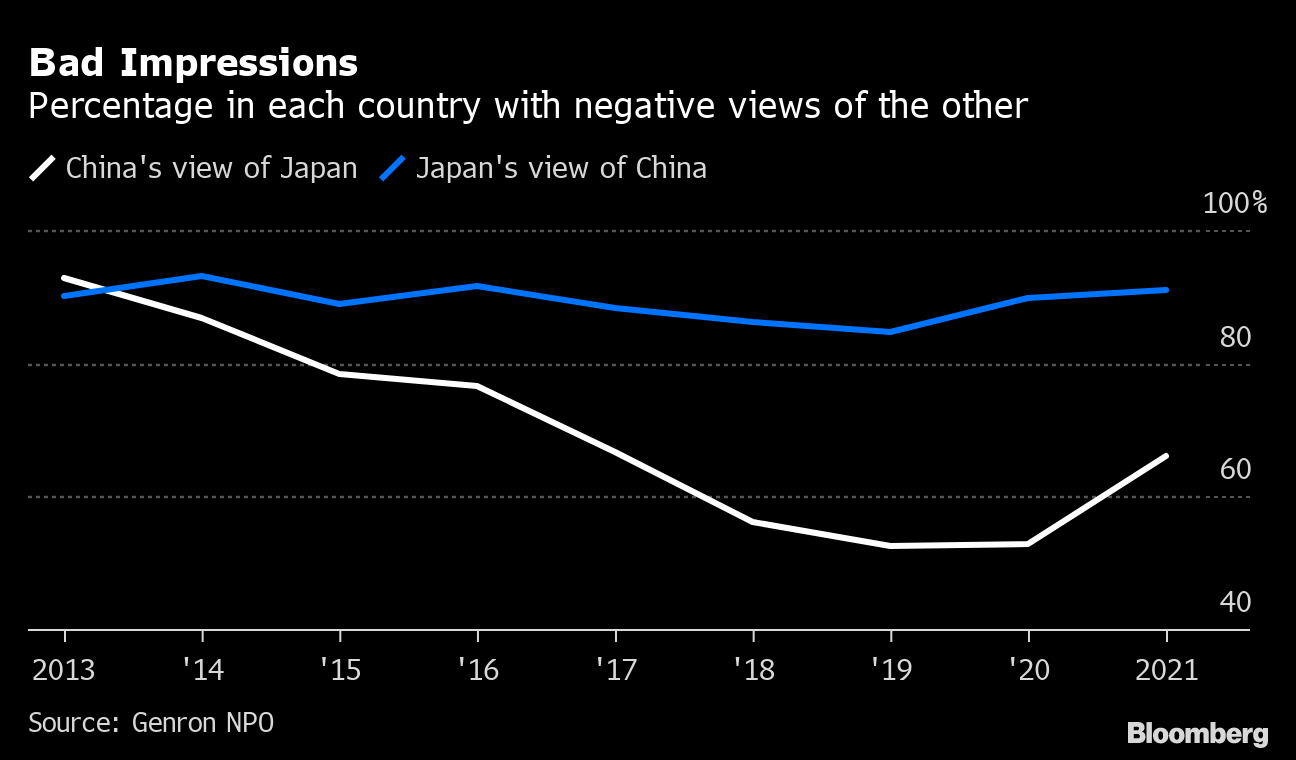 More than 66% of Chinese said their image of Japan was “not good,” well up on the 53% who said that in 2020, according to the survey, making any move from China to improve ties less likely, even if the leadership wanted to.
