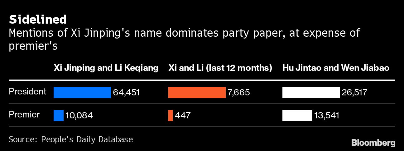 During Xi's decade in power, the president's name has been mentioned in the People's Daily more than six times as frequently as Li Keqiang's, according to a Bloomberg analysis. That compares with a 2-to-1 ratio during the previous decade when President Hu Jintao and Premier Wen Jiabao were in charge.