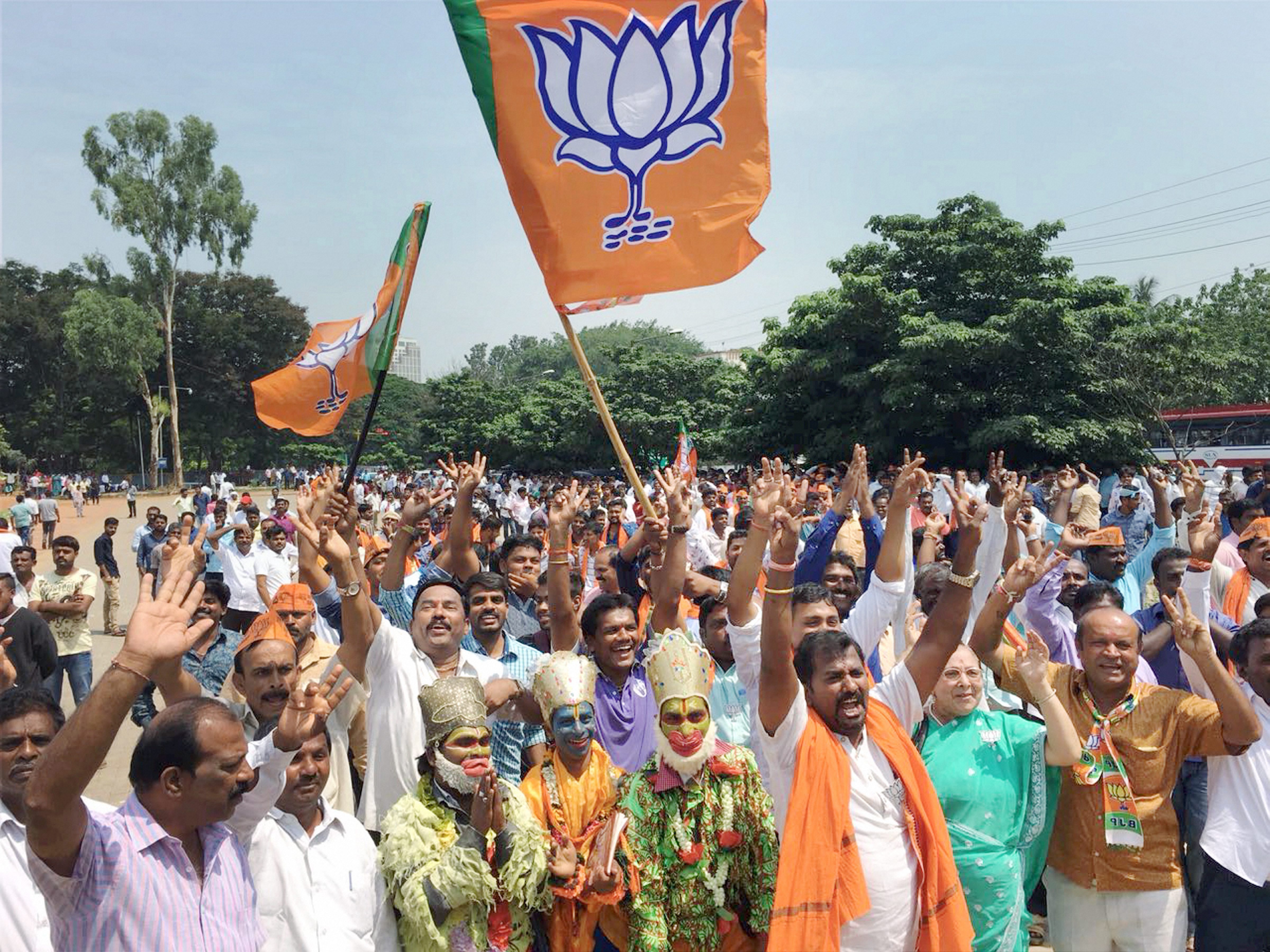 BJP workers celebrate in Bengaluru. (Photographer: Shailendra Bhojak/PTI)