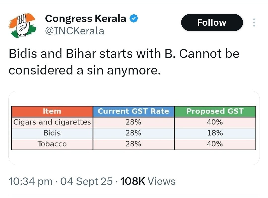 Indian National Congress' Kerala wing on Friday stirred controversy on social media after comparing Bihar to a Bidi. In a now-deleted post, the Congress unit took a dig at the latest Goods and Services Tax reform, which exempts bidis from "sin goods" and places it under 18% tax bracket. Meanwhile other sin goods are placed under 40% tax bracket.