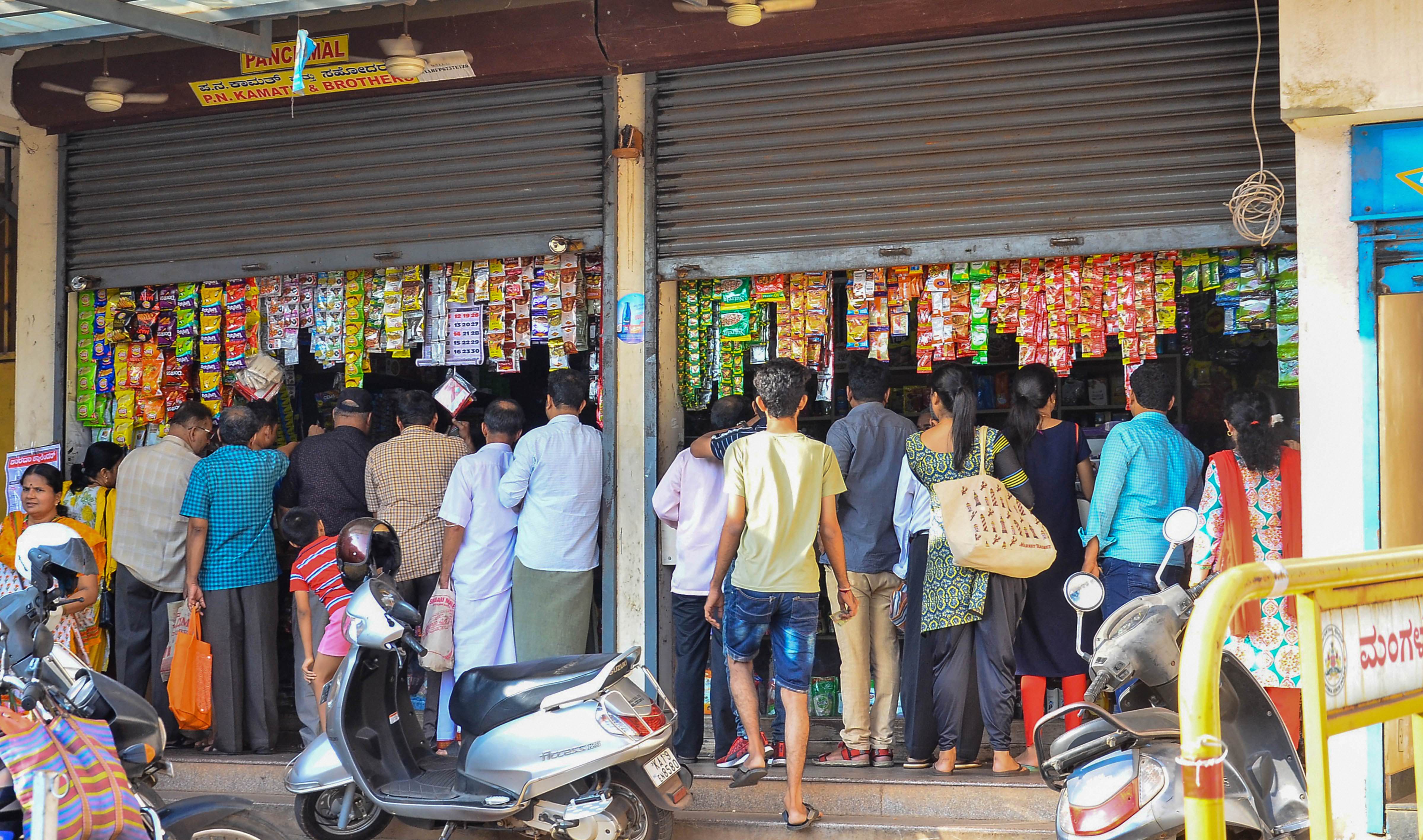 Residents buy daily items at a shop after curfew was relaxed in Mangaluru. (Source: PTI)