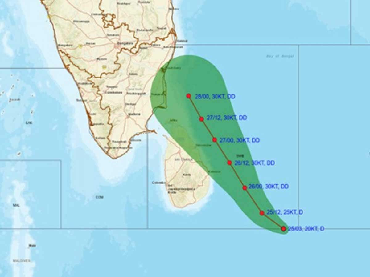 The IMD predicted squally wind speed reaching 45-55 kmph gusting to 65 kmph is very likely to prevail over southwest Bay of Bengal, adjoining southeast Bay of Bengal and along and off Sri Lanka coast on Nov. 25.