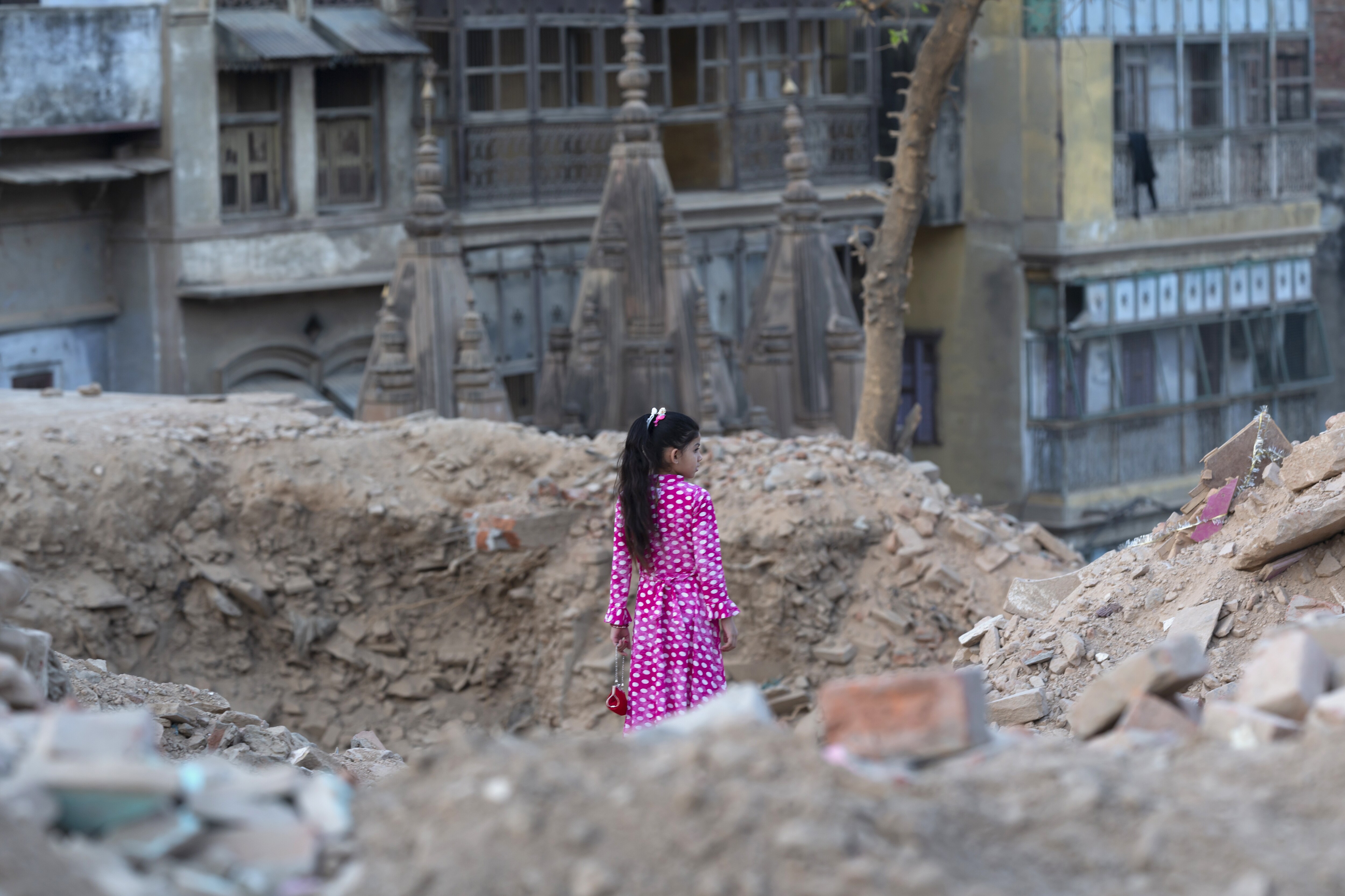 A young girl stands in the rubble of property demolished for the Kashi Vishwanath corridor project, which aims to provide devotees easier access to the Kashi Vishwanath temple, in Varanasi, Uttar Pradesh, India. (Photographer: Kanishka Sonthalia/Bloomberg)