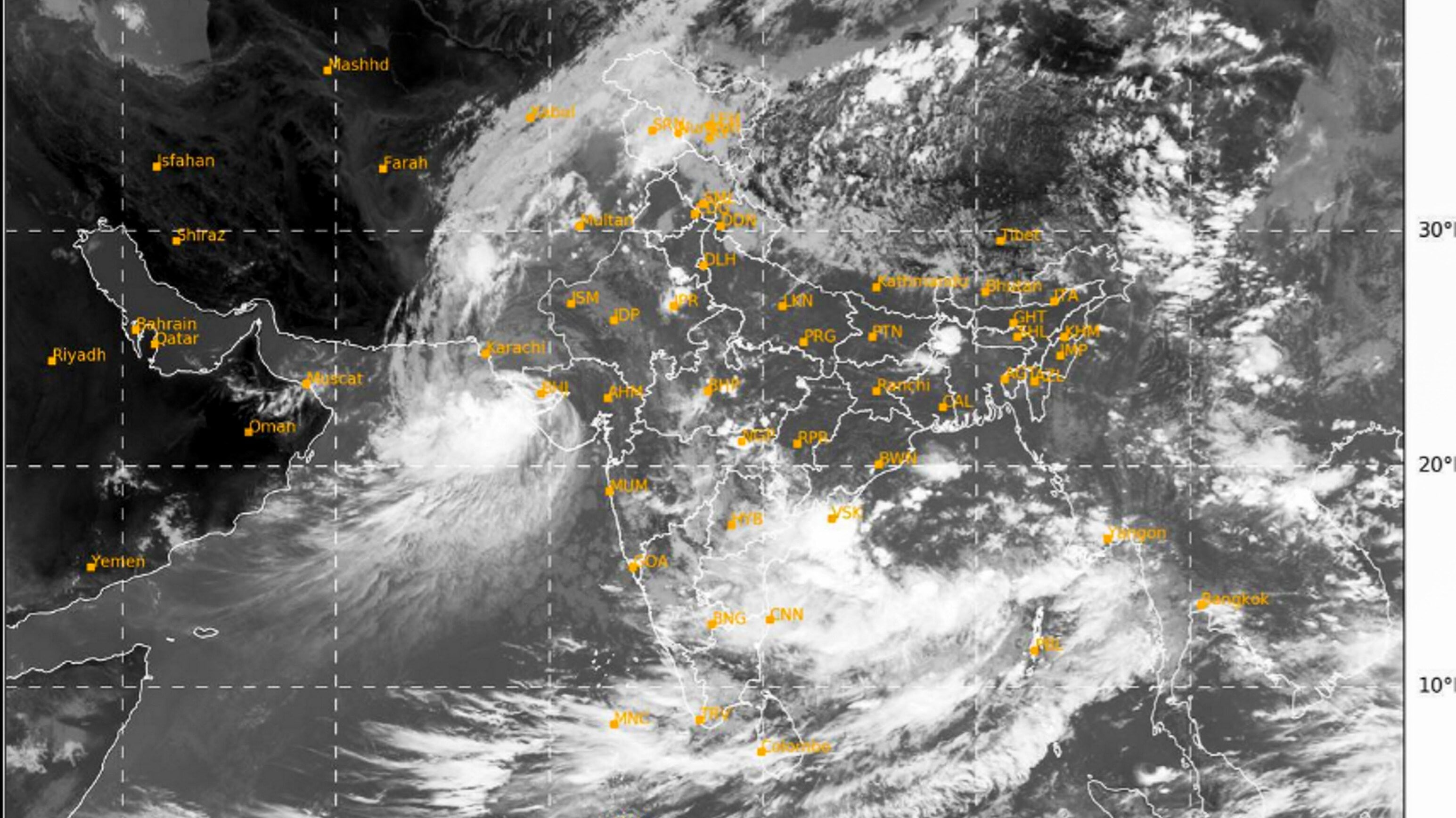 Currently, the sea surface temperature in the Bay of Bengal is 28-30 degrees Celsius. It is around 27-28 degrees Celsius in the Arabian Sea.