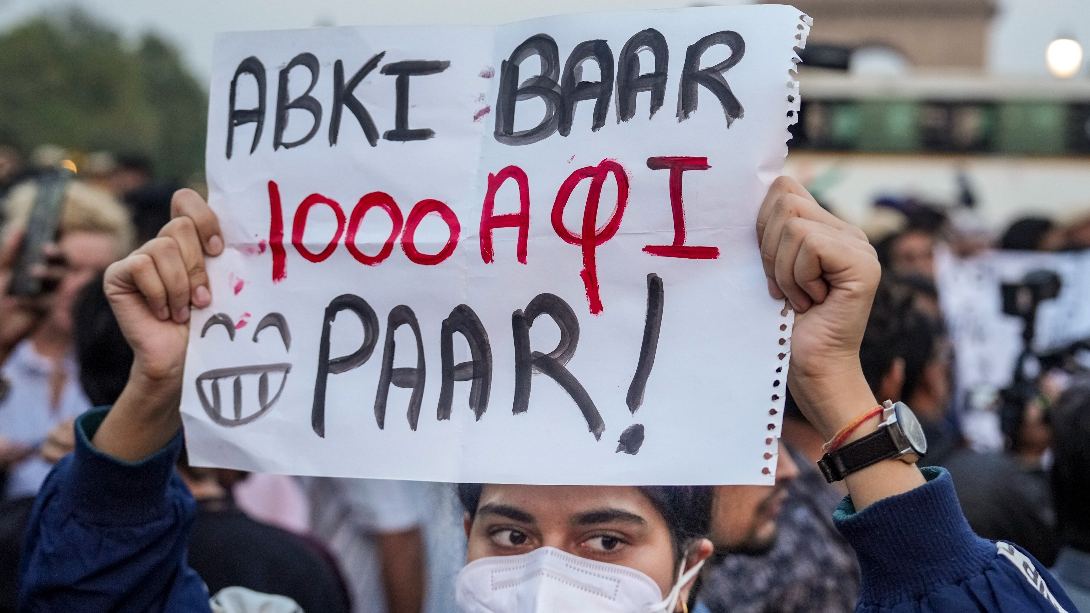 A demonstrator holds a placard during a protest over the deteriorating air quality in the national capital region, in New Delhi. (Photo: PTI)