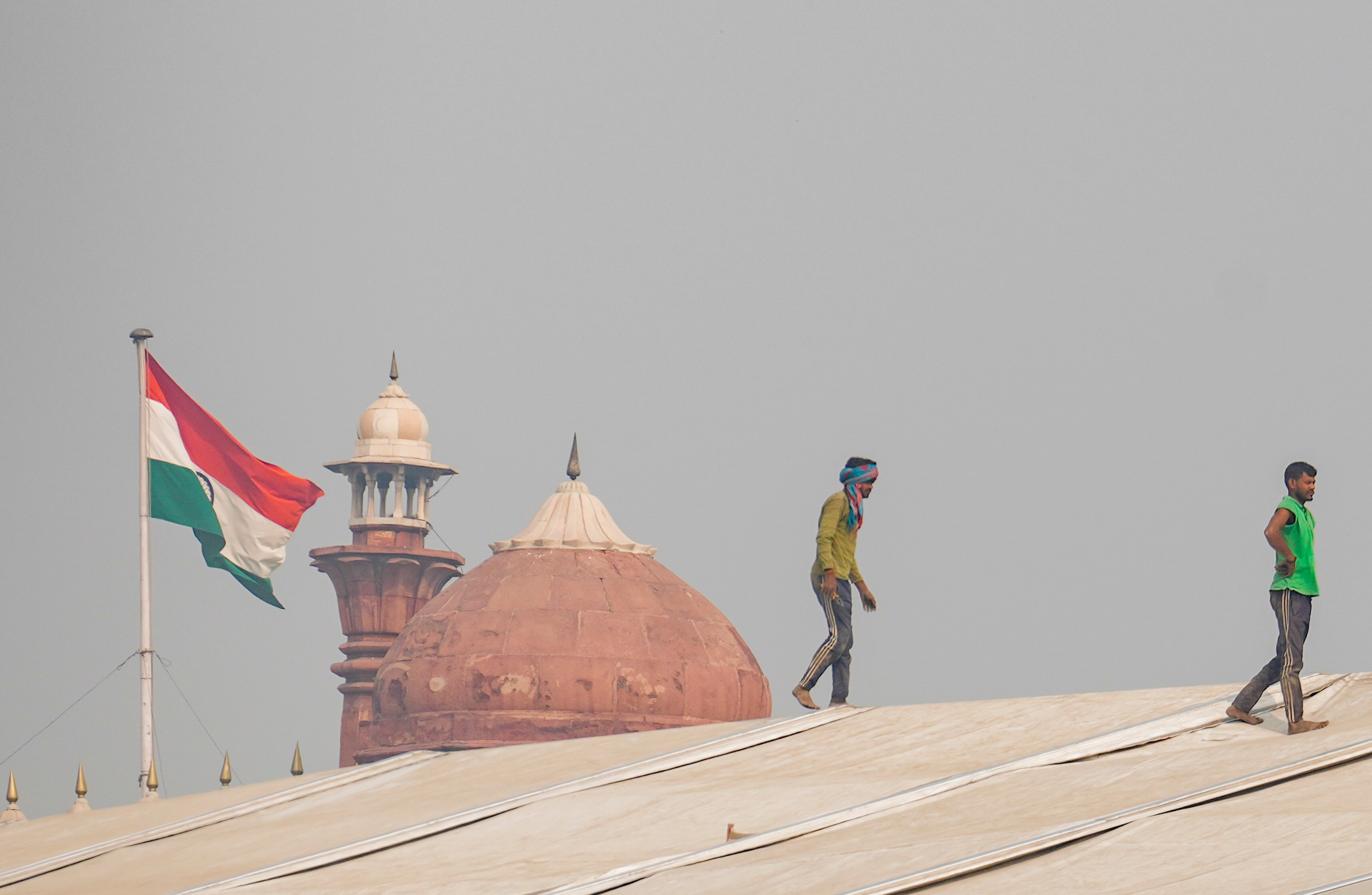People walk on the roof of a tent set up near Red Fort, in New Delhi on Tuesday, Nov. 11, 2025. (Photo: PTI)