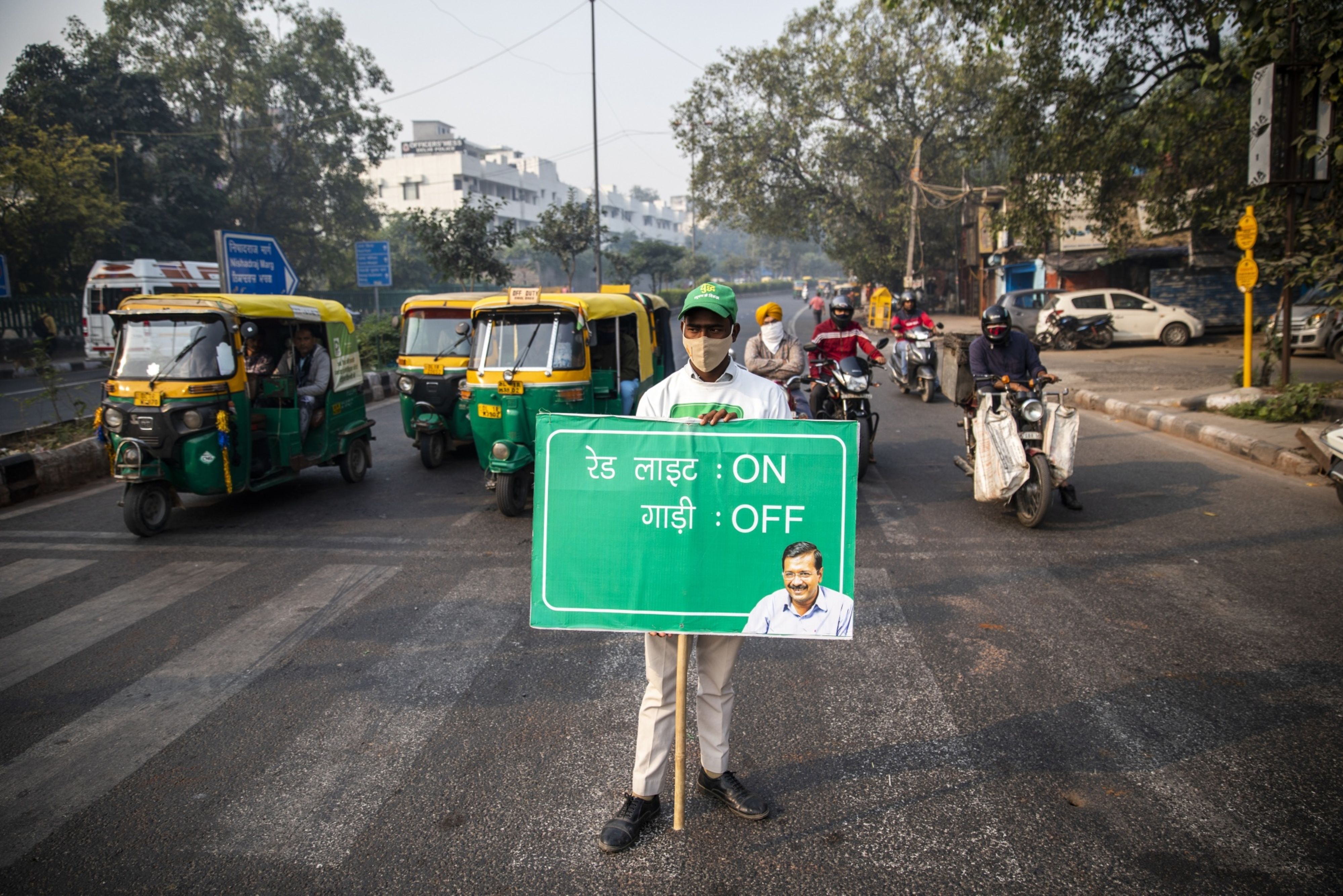 A worker holds a sign requesting motorists to turn off their engines while waiting at a traffic signal in New Delhi. (Photographer: Prashanth Vishwanathan/Bloomberg)