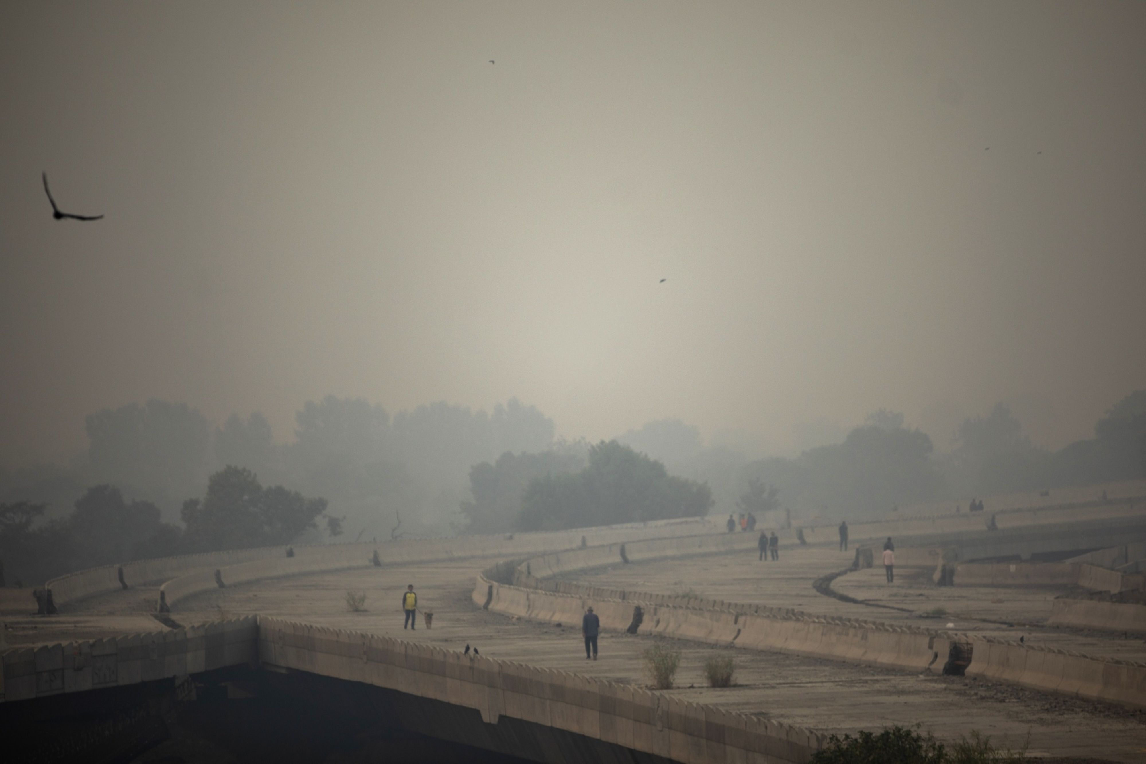 People walk along an under construction overpass in New Delhi shrouded in smog. (Photographer: Prashanth Vishwanathan/Bloomberg)