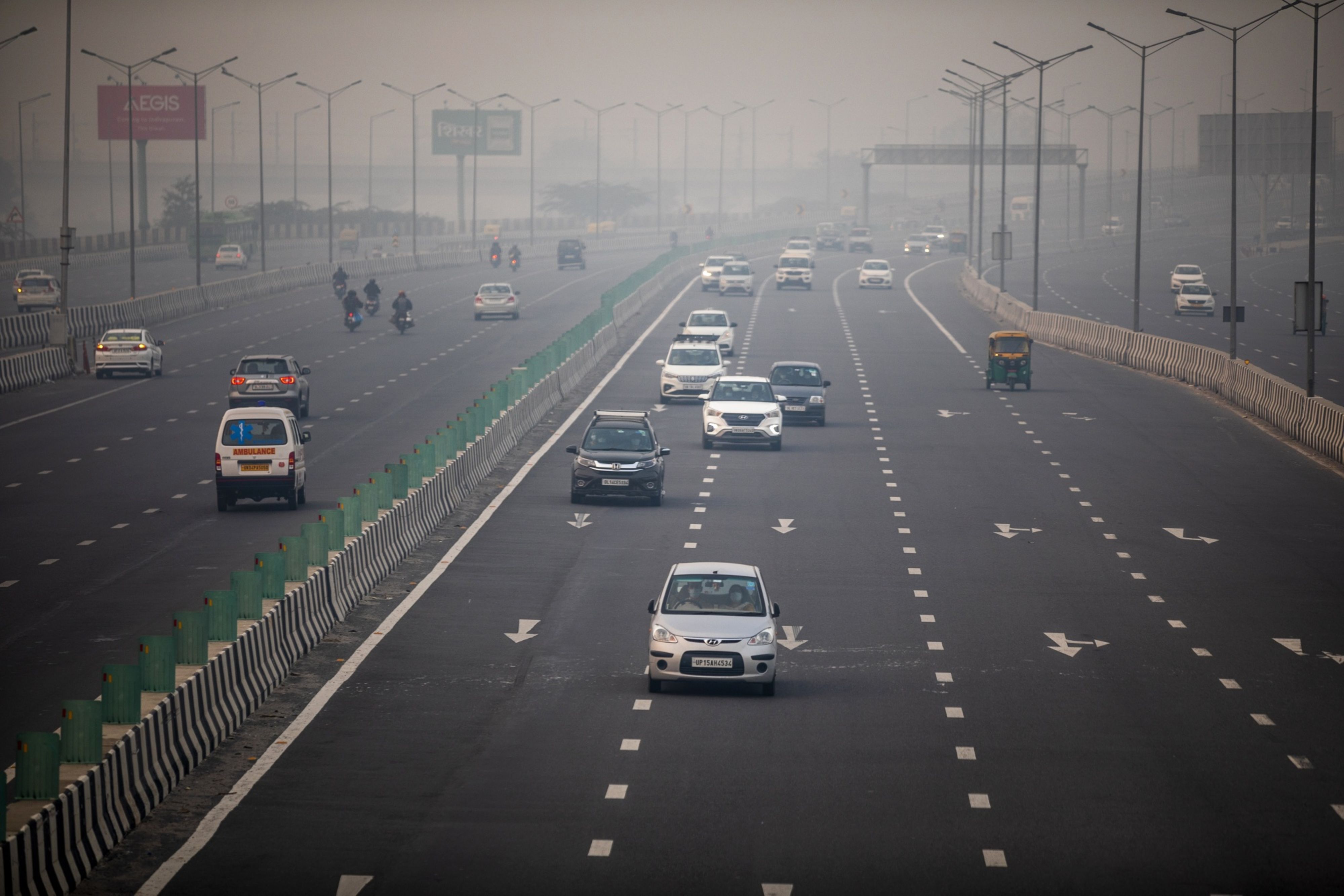 Vehicles travel along a national highway shrouded in smog in New Delhi. (Photographer: Prashanth Vishwanathan/Bloomberg)